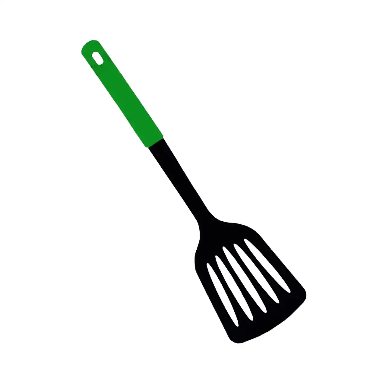 Paleta plastic de bucatarie cu lungimea de 30 cm de culoare neagra cu verde este un produs des utilizat in bucatariile proprii pentru manevrarea mancarurilor, bucatilor de carne sau cartofilor din tigaie. Paleta din plastic de bucatarie va ajuta intoarceti sau ridicati alimentele din uleiul incins, mentinandu-va mainile ferite de orice pericol. Paleta de plastic pentru bucatarie este foarte flexibila, astfel incat sa nu se rupa in urma utilizarilor dure si dispune de perforatii alungite ce permite scurgerea rapida a uleiului. Mai mult decat atat, paleta plastic de bucatarie se curata cu mare usurita atat manual cat si in masina de spalat vase.