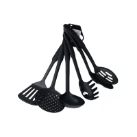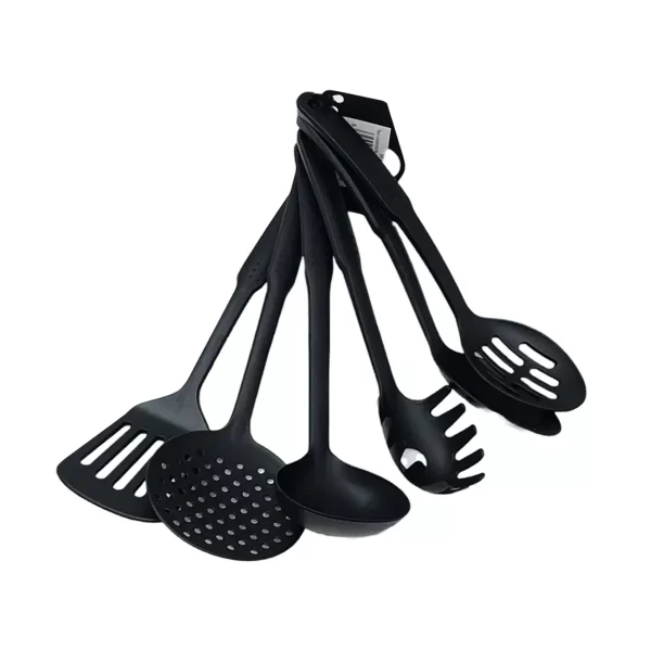 Setul de palete bucatarie din plastic, negre (6 bucati) este ideal pentru toate gospodine si bucatari din orice bucatarie. Setul de palete pt bucatarie cuprinde urmatoarele: paleta plina, perforata, spumiera, polonic, lingura mare simpla si o lingura de paste. Paletele de bucatarie sunt de mare folos atunci cand folositi bucatarie pentru pregatirea oricarui fel de mancare, fie ca prajiti, fierbeti sau doar incalziti. Acestea sunt foarte rezistente la uzura, acizi alimentari si temperaturi ridicate. Totodata, au un design modern se curata usor si sunt compatibile cu mansinile de spalat vase. Depozitarea acestor palete de bucatarie din plastic se poate face in sertarul cu ustensile de bucatarie sau in suporti suspendati.