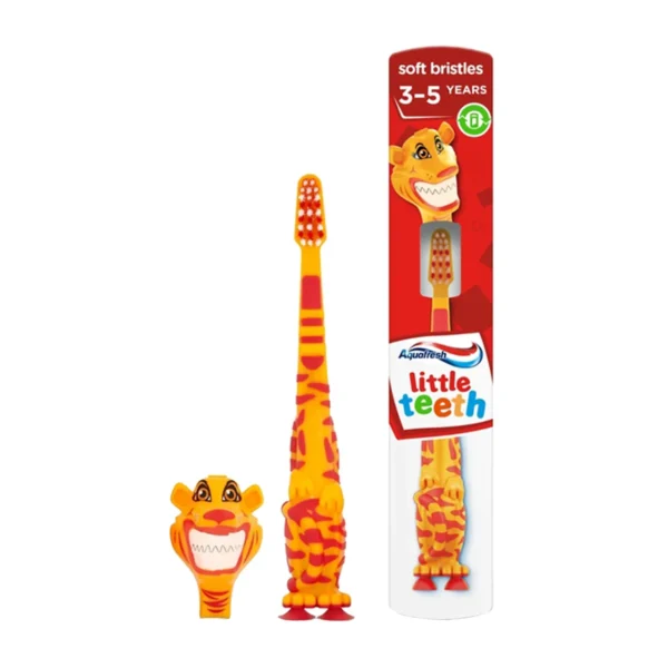Periuta de dinti copii 3-5 ani Aquafresh Tilly the Tiger este conceputa special pentru copiii cu varsta cuprinsa intre 3 si 5 ani intrucat dispune de peri moi care nu cauzeaza neplacere si nu irita gingiilie sensibile ale copiilor in timpul periajului dintilor. In schimb, periuta de dinti pentru copii 3-5 ani curata eficient atat dintii cat si spatiile stramte intre dinti (denumit si periaj interdental). Periuta de dinti Aquafresh este placut modelata in forma unui tigru numit Tilly si are capacel care protejeaza perii atat de impuritati cat si impotriva deteriorarii. Totodata, periuta de dinti are o dimensiune potrivita pentru mana copilului, permitandu-i sa o manevreze cu usurita. In acest fel iti vei motiva copilasul intr-un mod distractiv sa isi dezvolte obiceiul spalarii dintilor si importanta pastrarii dintilor curati si sanatosi.