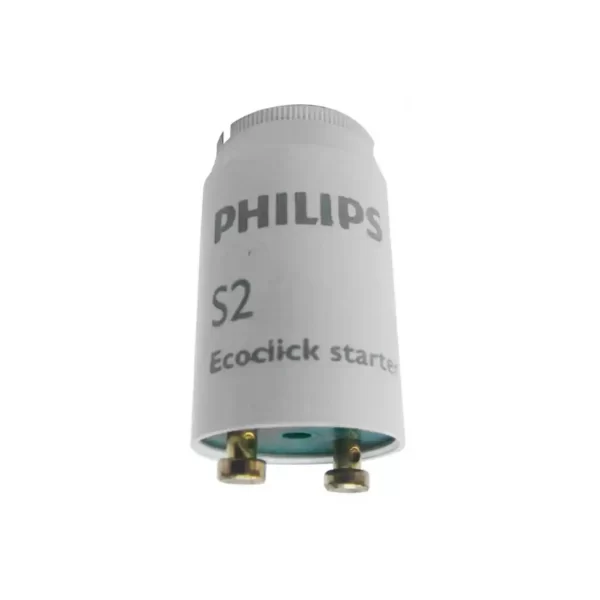 Starterul ecoclick tip S2 pentru neoanele ce opereaza intre 4 si 22 wati de la Philips este un intrerupator cu aprindere incandescenta pentru sursele de iluminat clasice care functioneaza cu balast electromagnetic. Starterul Philips S2 are 2 pini incorporati in corpul sau si capacitor superior pentru a suprima interferentele undelor radio. Pinii starterului de neon sunt realizati din alama pentru o conductivitate sporita, protejand in acelasi timp de oxidanti. Starterul ecoclick S2 cu operare intre 4-22W nu contine plumb sau izotopi radioactivi, are puls de tensiune rapida (aprindere rapida).