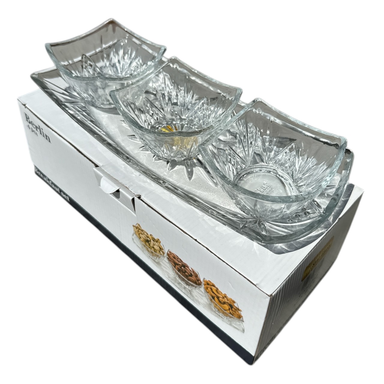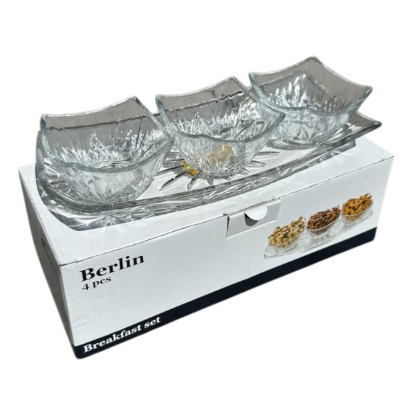 Platoul cu 3 boluri din sticla transparenta pentru micul dejun este un set practic si elegant, perfect pentru servirea micului dejun. Acest set include o tava si 3 boluri fabricate in intregime din sticla transparenta foarte groasa, care ofera atat siguranta cat si o vedere clara asupra continutului. Bolurile sunt potrivite pentru servirea diverselor alimente, cum ar fi cerealele, iaurtul sau fructele proaspat taiate. Acestea au o capacitate de 250 ml pentru a satisface nevoile unei singure persoane. Dea semnea, acestea sunt foarte usor de curatat. Platoul / tava este conceputa pentru a sustine ai a prezenta elegant bolurile pe masa.