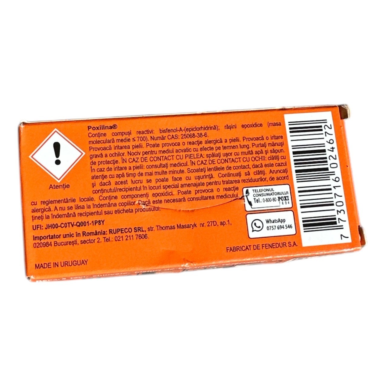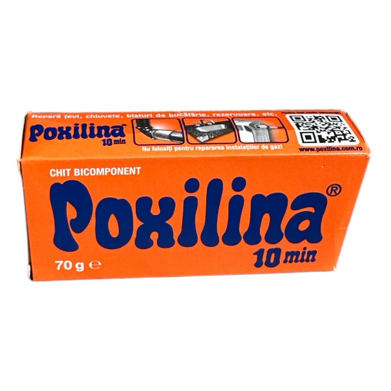 Poxilina 10 min este un chit bicomponent (adeziv) in cantitate de 70 grame cu calitati extraordinare pentru etansarea, umplerea si lipirea tevilor ale instalatiilor de apa, lavoarelor/toaletelor, blaturilor din lemn, canalizarilor sau rezervoarelor de apa sau combustibil. De asemenea este des folosit si pentru lipiri foarte de durata in beton sau marmura. Poxilina 10 min (chit bicomponent) 70 g va ofera posibilitatea de a repara urgent orice fel de problema aparuta in casa sau gradina, avand o intarire completa (chiar si la temperaturi scazute) in doar 10 minute. Poxilina are o rezistenta superioara la apa, solventi si acizi, este un izolator electric excelent, nu se degradeaza in timp si nu se corodeaza. NU lipeste teflonul, polipropilena si nu trebuie folosit pentru repararea tevilor prin care trec gaze naturale / combustibile.