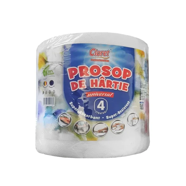 Prosopul de hartie in 4 straturi de la Cloret este o rola ce contine 160 de foi dimensionate la 22x22 cm si sunt compuse din 4 straturi de hartie celulozica 100%. Acest tip de prosop de hartie este abolut necesar intr-o bucatarie intrucat este super absorbant si rezistent putand fi utilizat intr-un mod universal pentru a va sterge pe maini pentru eliminarea umiditatii de pe alimente sau curatarea diferitelor suprafete, cum ar fi: blatul de lucru, masa si multe altele. Prosopul din hartie cu 4 straturi nu lasa scame sau alte impuritati pe suprafetele si obiectele curatate.