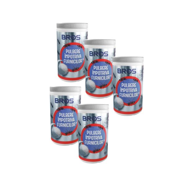 Pulbere impotriva furnicilor Bros la pachet de 5 x 100g este un produs folosit in mod special pentru combaterea furnicilor aparute in spatii interioare si in imediata vecinatate: terase, alei, poteci, case de vacanta, etc.