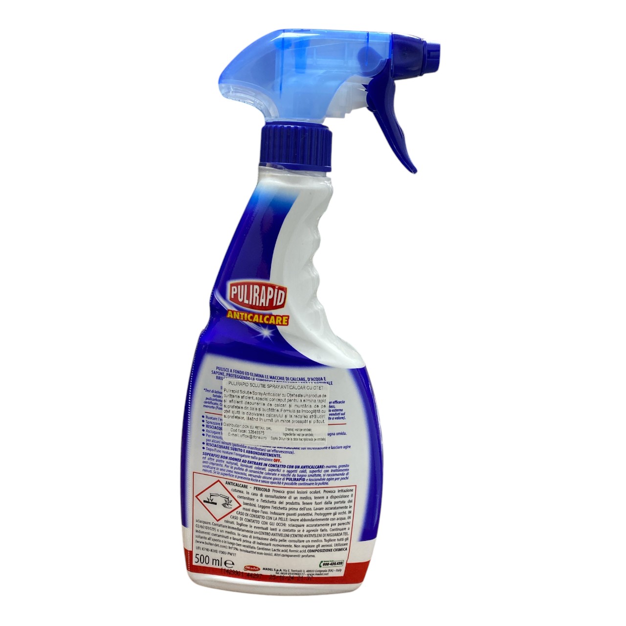 Pulirapid este o solutie impotriva calcarului ce contine otet si vine ambalata la sticla de 500 ml dotata cu cap pulverizator. Acest tip de produs a fost conceput pentru a utiliza cu succes proprietatile acide ale otetului in combaterea eficienta a calcarului. Otetul "arde" depunerea de calcar si multe alte reziduuri de murdarie, prin descompunerea lor treptata. Folosind aceasta solutie anticalcar Pulirapid, suprafetele si obiectele sanitare devin mult mai usor de spalat si lustruit.