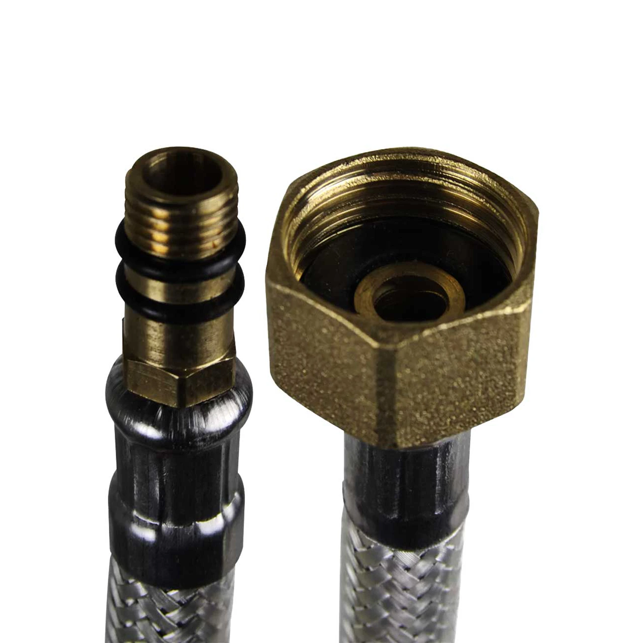 Racord flexibil pentru apa baterie 1/2 51cm monocomanda este un accesoriu care se foloseste in majoritatea instalatiilor sanitare bazate pe alimentare cu apa. Acesta uneste robinetul de alimentare cu bateria de la chiuveta, alimentarea cu apa de la masinile de preparat cafea, in cazul filtrelor de apa, etc. Racord flexibil pentru apa baterie 1/2 51cm monocomanda are structura fabricata in interior dintr-un tub de cauciuc alimentar si la exterior este invelit intr-un strat impletit de fire metalice din otel inoxidabil. Piulita, stutul si bucsa sunt facute din alama cromata care au in capatul acestora o garnitura din cauciuc.