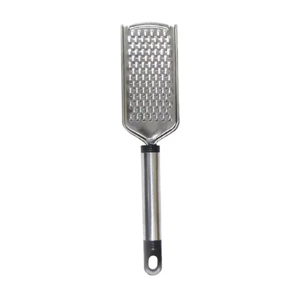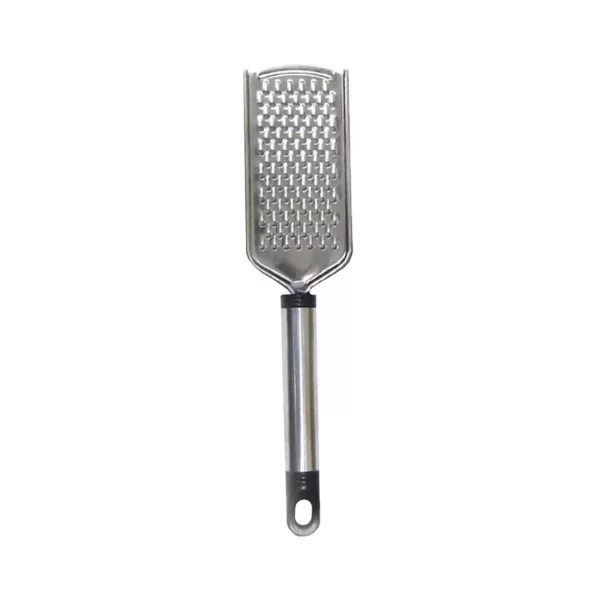 Razatoarea de parmezan cu coada este fabricata in intregime din otel inoxidabil, are o singura fata de raziut, dreapta, cu forma dreptunghiulara. Coada ce serveste ca maner este ergonomica, placut la atingere si confera fermitate in apucare si o manevrare foarte buna in timpul razuirii. Tipul acesta de razatoare parmezan este excelenta pentru toate branzeturile tari, pentru miezul de nuca de cocos, ciocolata sau alte produse alimentare solide. Fata de raziuit este prelucrata cu mici denivelari cu terminatii in forma de stea, ce vor asigura o razuire subtire la fiecare utilizare. Razatoarea pentru parmezan nu rugineste si se poate curata usor la mana sau in masina de spalat vase.