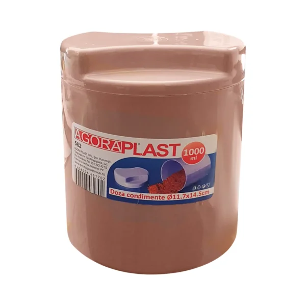 Recipientul de condimente din plastic dotat cu capac, volum de 1000 ml, culoare maro marca Agora Plast, este un accesoriu de bucatarie extrem de util. Acesta este obtinut din polipropilena, material cunoscut pentru rezistenta sa la socuri, uzura si umiditate. Diametrul de 11.7 cm si inaltimea de 14.5 cm ofera un spatiu de 1000 ml (1 litru) pentru a putea depozita pe timp indelungat o varietate larga de condimente, precum: Piper macinat sau boabe, sare, zahar, sofran, diferite ierburi aromatice sau amestecuri de condimente speciale. Mai mult decat atat, le puteti utiliza si pentru alte tipuri de alimente, tip praf / pulbere, precum faina, malaiul sau grisul. Designul sau simplu si materialul permite o curatare rapida, cu minim de efort depus.