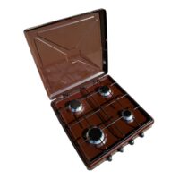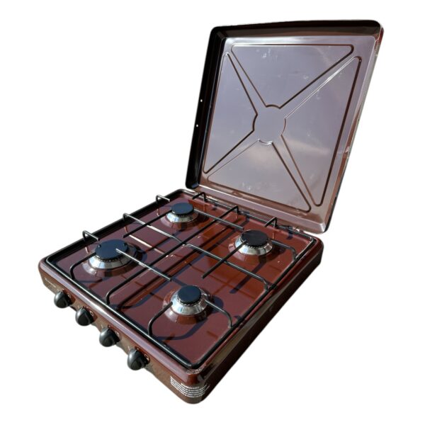 Aragazul cu 4 ochiuri de culoare maro cu dimensiunea de 55x51 cm este un produs resigilat intrucat a fost lovit pe unul din colturi in timpul transportului.