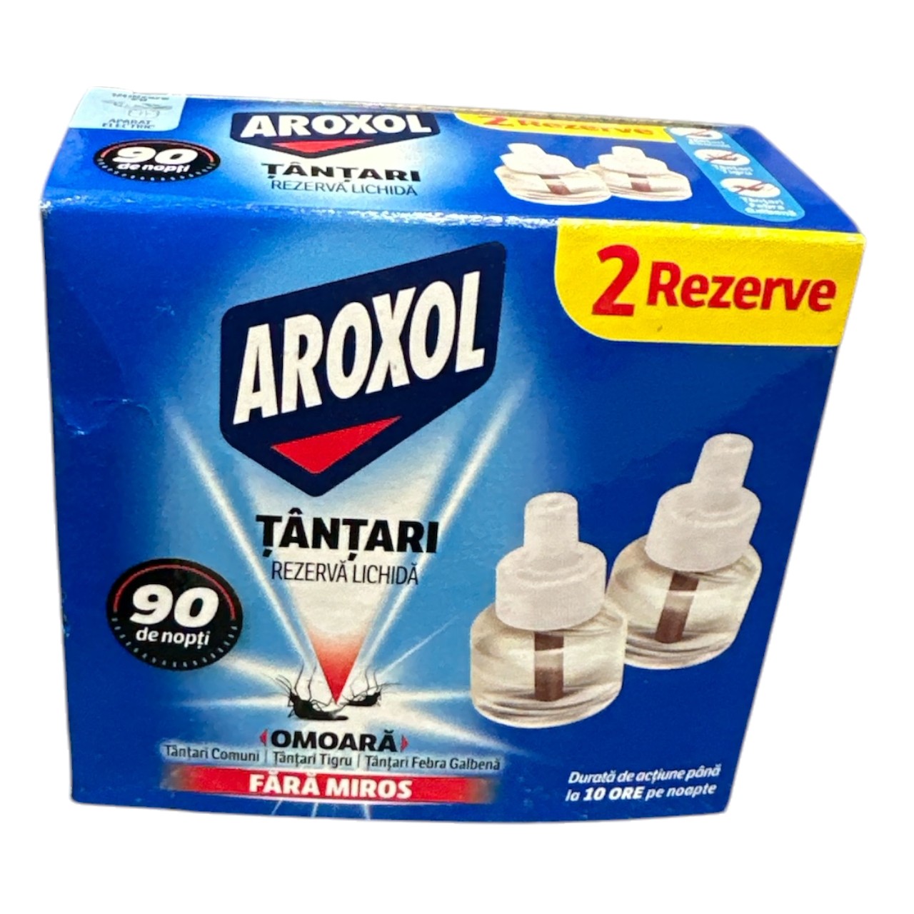 Rezervele Aroxol de tantari in cantitate de 2 x 35 mililitri va ajuta sa distrugeti toti tantarii din casa si va protejeaza de acestia prin vaporii care se degaja la incalzirea lichidului din rezerva. Cu Aroxol lichid veti avea un somn linistit fara intepaturi sau bazaituri de tantari timp de 45 de zile 8 ore pe noapte.