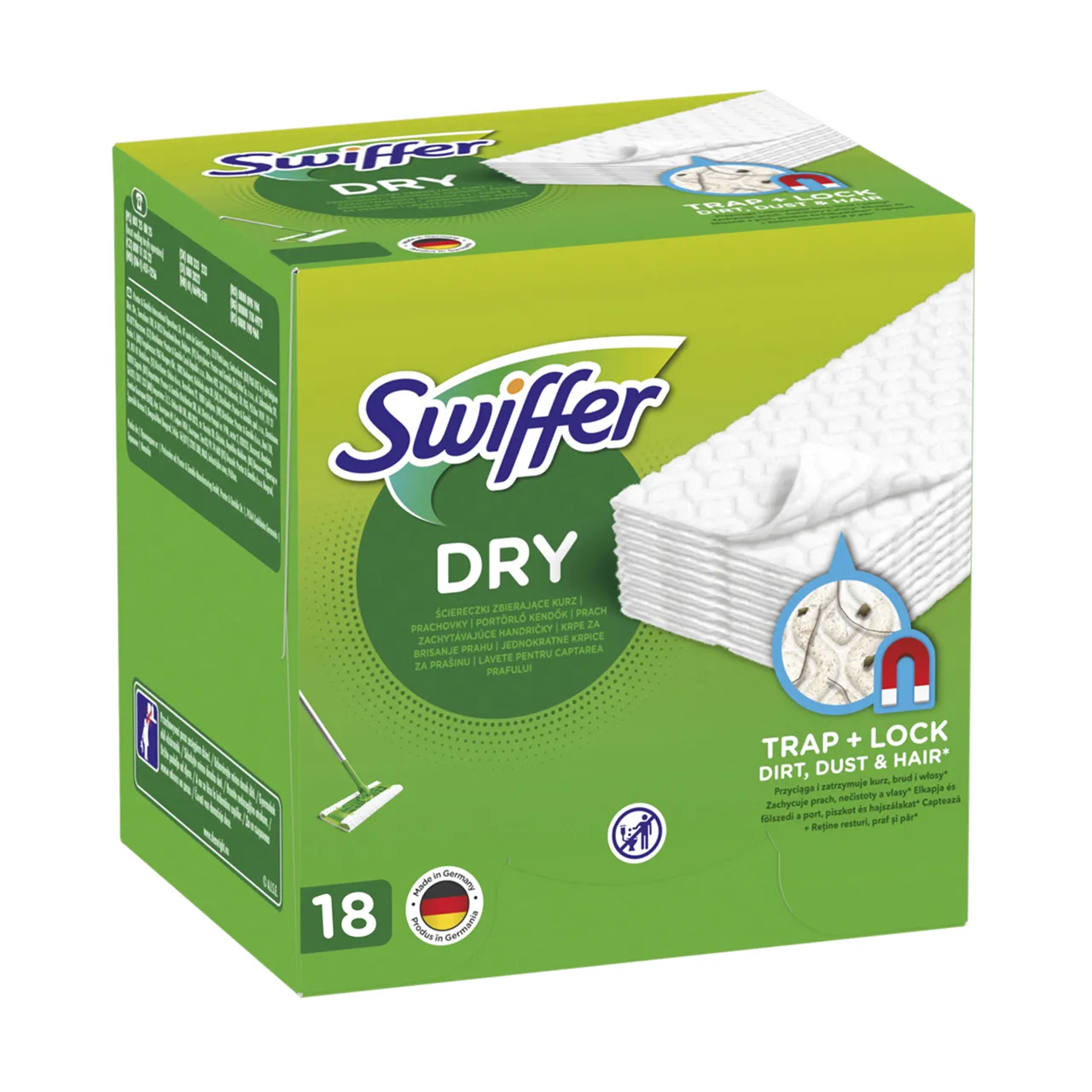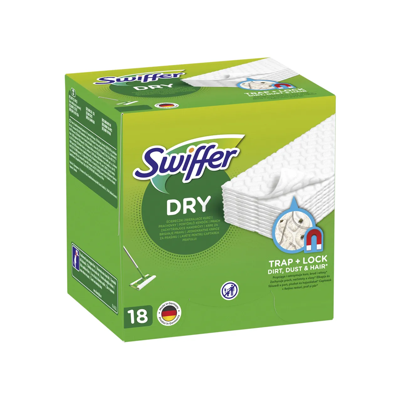 Rezerve uscate Swiffer, in pachet de 18 bucati, sunt concepute pentru a fi utilizate impreuna cu mopul Sweeper, oferindu-ti o modalitate eficienta si rapida de a captura si mentine murdaria, praful si parul (chiar si cel al animalelor de companie) de pe orice tip de pardoseala din propria ta locuinta. Acestea depasesc cu succes performantele cu care ne-am obisnuit al unui mop traditional.