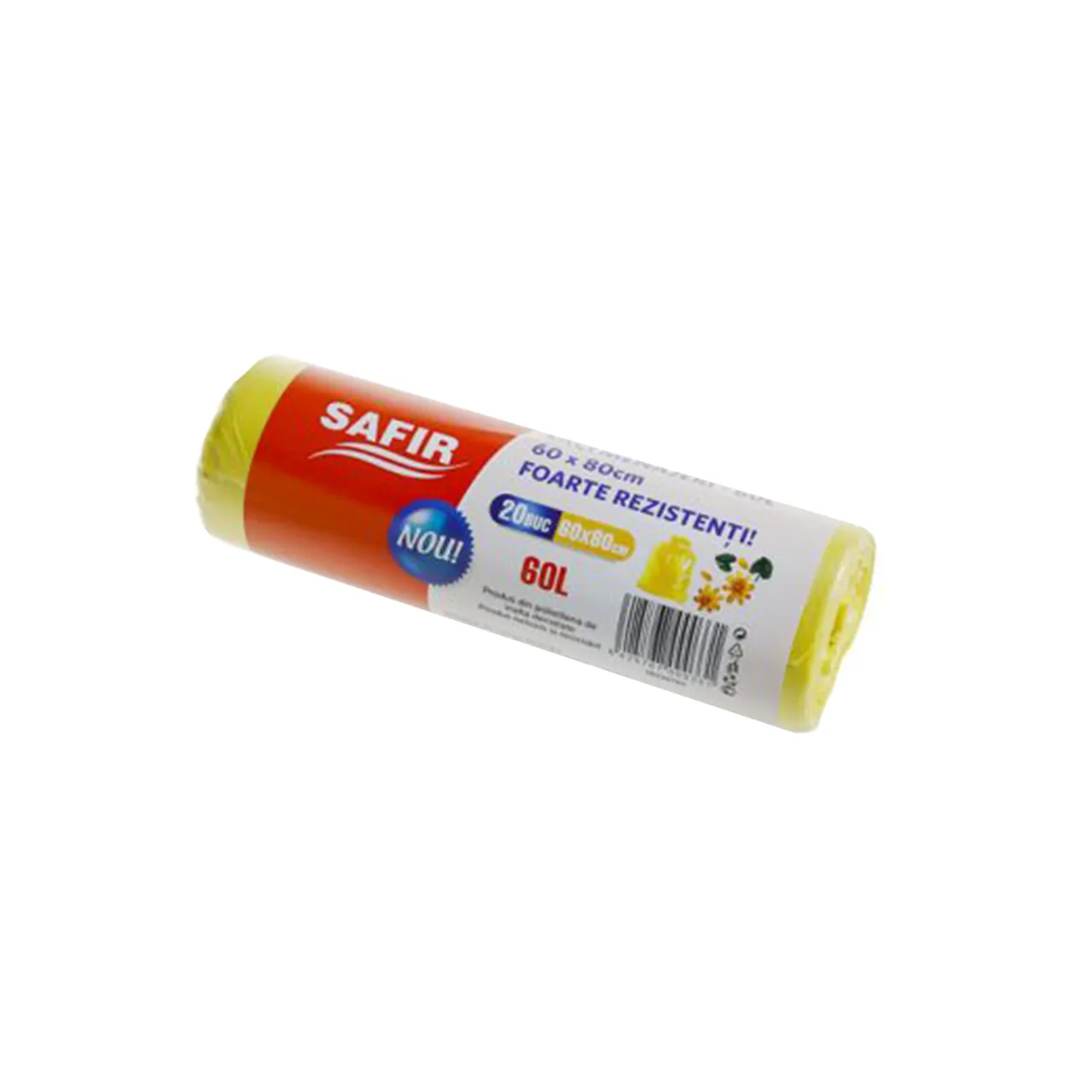 Saci menajeri de 60 L cu dimensiunile de 60x80 cm, de culoare galbena marca Safir, ce vin la rola de 20 de bucati sunt solutia ideala pentru gestionarea eficienta a deseurilor menajere in gospodarie, bucatarie sau la locul de munca. acestia sunt foarte voluminosi si rezistent la rupere pentru a face fata unor cantitati mai mari de deseuri, facandu-i ideali pentru colectarea si eliminarea lor intr-un mod rapid si comod.