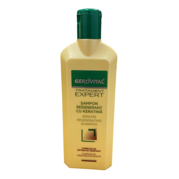Gerovital Tratament expert sampon regenerant cu keratina la 250 ml este un produs destinat ingrijirii parului prin refacerea nivelului de keratina, asigurarea elasticitatii si protectiei acestuia impotriva efectelor distructive ale agentilor nocivi din exterior. Samponul regenerant Gerovital este potrivit pentru toate tipurile de par intrucat contine o combinatie speciala de vitamine, oligoelemente si extracte naturale care ajuta la refacerea structurii firului de par. Ingrediente importante din compozitia sa includ keratina hidrolizata, proteina esentiala a firului de par, placental protein si hydrolyzed soy protein care ajuta la regenerarea, hidratarea si protejarea parului.