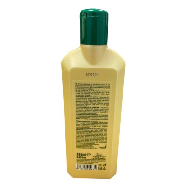 Mod utilizare: Samponul regenerant cu keratina se aplica direct pe parul umed si se maseaza constant scalpul timp de minim 1 minut pentru a stimula si tonifia corespunzator pielea capului. Se clateste cu apa din abundenta.