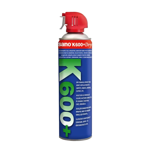 Insecticidul Sano K600 formula uscata (dry) este un aerosol in cantitate de 500ml cu miros puternic floral si aplicare direct pe suprafetele afecatate. Acesta nimiceste insectele zburatoare cum ar fi muste, tantari sau molii. Mai mult decat atat, Spray-ul sano K600 nu este periculos sanatatii oamenilor sau animalelor, putand fi folosit cu incredere in orice camera din locuinta.