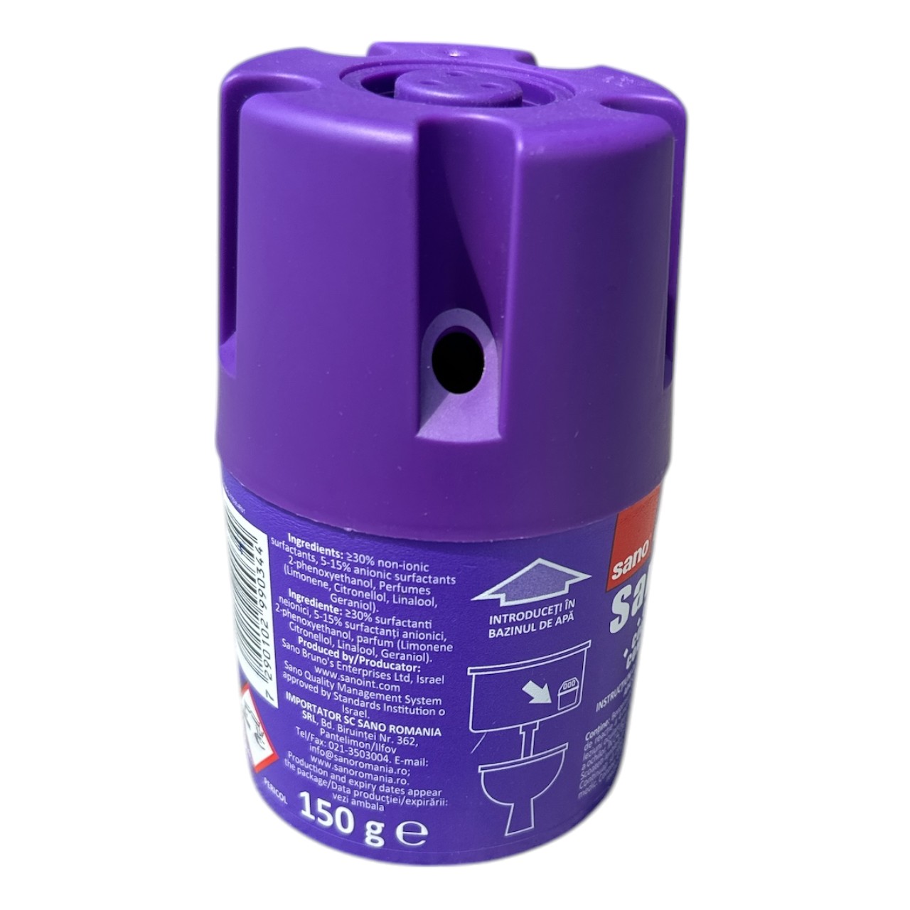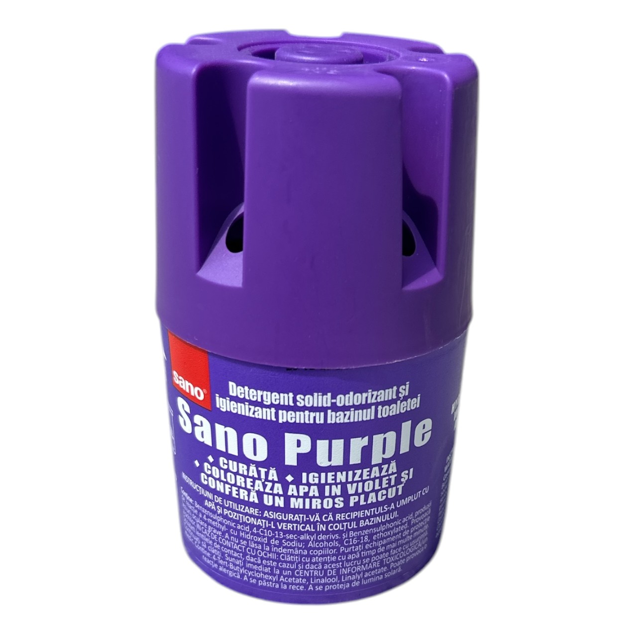 Sano purple odorizant WC 150 g a fost conceput pentru a oferi toaletei o prospetime desavarsita. Datorita ingredientelor, sano purple odorizant WC 150 g ofera apei din bazinul WC-ului un parfum proaspat si placut, in acelasi timp curatand, igienizand si colorand apa intr-o nuanta placuta de violet.