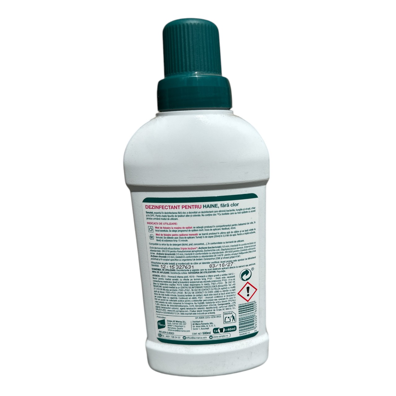 Dezinfectantul pentru haine (rufe) Sanytol in cantitate de 500ml este un lichid cu formula concentrata, fara clor (hipoclorit de sodiu) ce are unicul scop de a elimina bacteriile, ciupercile (fungii) si virusii prezenti pe toate tipurile de rufe, haine si alte textile chiar si in apa la 20 de grade celsius. Dezinfectantul pentru haine (rufe) Sanytol la 500 ml are un prospect larg impotriva nu numai a bacteriilor des intalnite ci si celor periculoase precum: Staphylococcus aerus, (stafilococul auriu) enterococcus hirae (enterococul hirae), escherichia coli, a fungilor cum ar fi: Candida albicans sau Aspergillus niger si nu in ultimul rand, a virusului gripal A (H1N1).