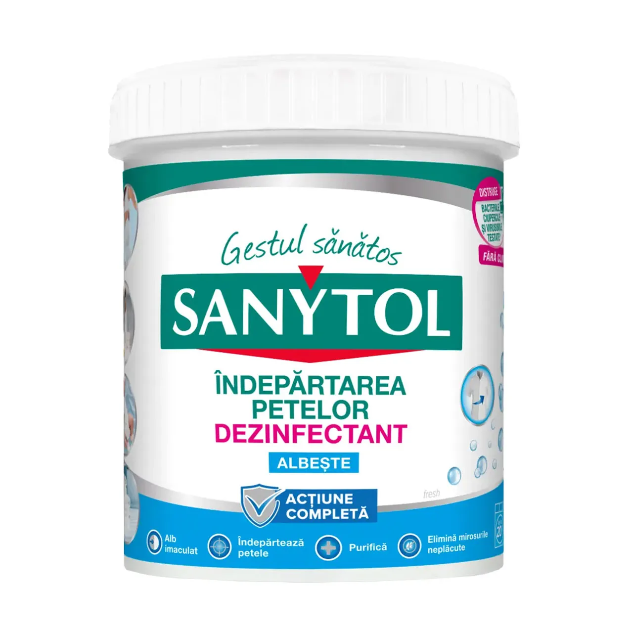 Sanytol Pudra este un produs dezinfectant de haine care scoate si pete ce vine ambalat intr-un flacon de 450 grame. Produsul poate elimina bacteriile si virusii, chiar si la temperaturi mai scazute, cum ar fi 20 de grade celsius. Ofera o tripla actiune, fiind atat bactericid, cat si eficient pentru indepartarea petelor persistente cu efect de albire si a mirosurilor neplacute. Este recomandat pentru toate tipurile de tesaturi albe, inclusiv lenjerie intima, sosete, maiouri, tricouri, haine pentru bebelusi si copii, lenjerii de pat, prosoape de baie sau bucatarie si cearsafuri.