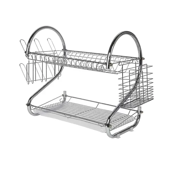 Scurgatorul (picuratorul) de vase etajat din otel cromat vine cu tava din plastic alimentar ce are rolul de a retine apa scursa dupa vase cat si pentru sustinerea castroanelor. Lateralele scurgatorului de vase pentru chiuveta sunt prevazute cu suporti atat pentru pahare cat si pentru furculite, cutite linguri sau alte ustensile utile in bucatarie. Modelul acesta etajat de scurgator pentru vase confera un design inovativ si placut chiuvetei dumneavoasta. Fiind fabricat din otel, este foarte durabil si stabil (nu flambeaza), etajul scurgatorului/picuratorului poate sustine pana la 12 farfurii iar lateralele un total de 25 de ustensile si 6 pahare.