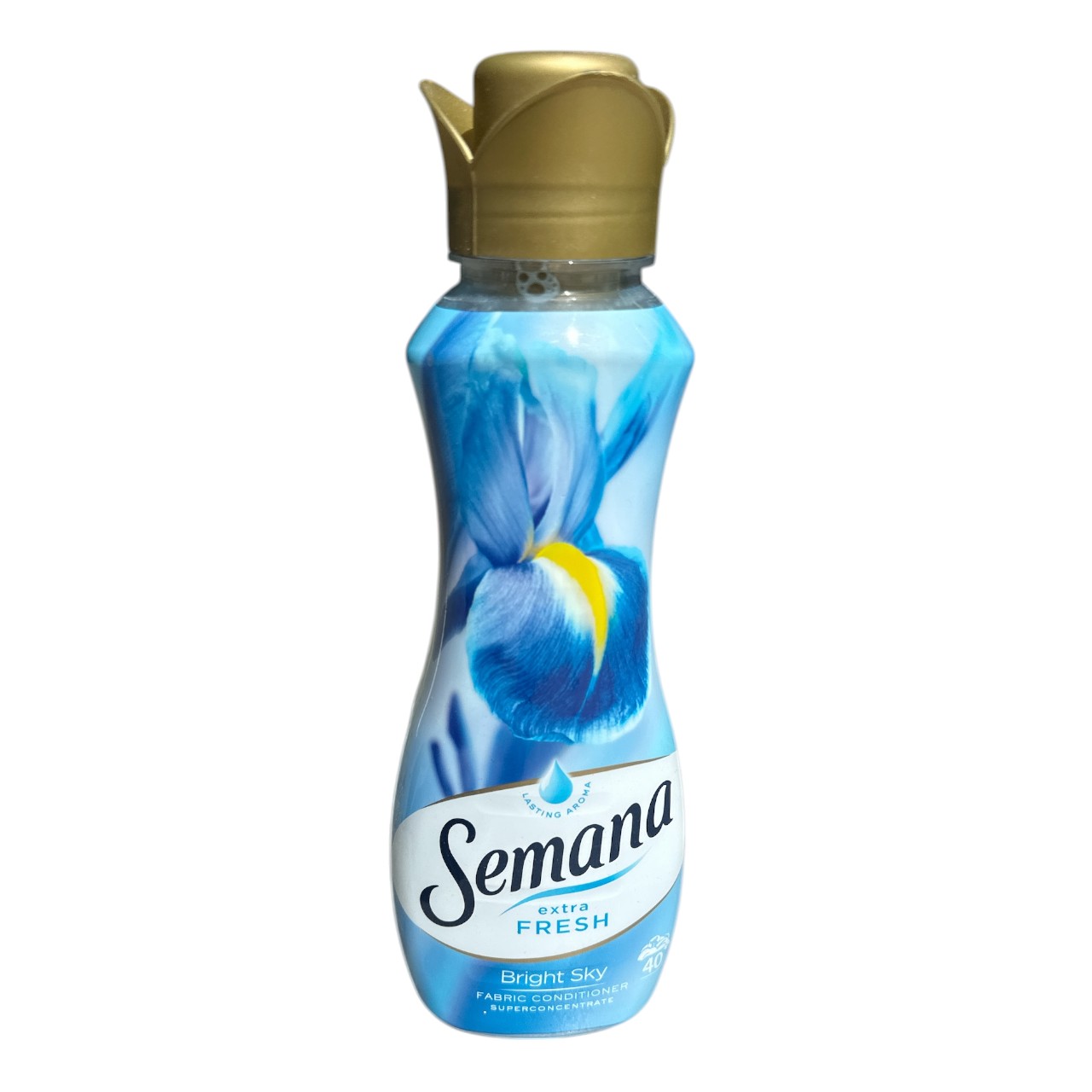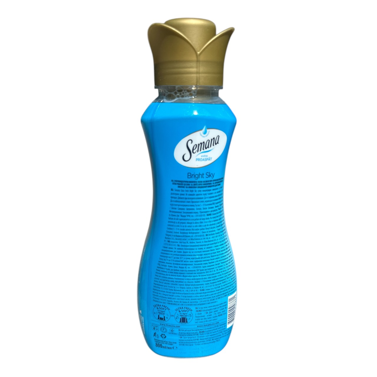 Semana Bright Sky Extra Fresh este un balsam de rufe la 800 ml ce ofera 40 de spari pentru o catifelare profunda a materialului, sa elimine efectul antistatic si sa faciliteze calcarea usoara a hainelor. Datorita formulei premium, balsamul Semana Bright Sky asigura o experienta unica, are grija de bugetul dumneavoastra si astfel poate satisface orice gospodina cu un total de 40 spalari. Balsamul Semana albastru foloseste cele mai bune ingrediente, noi tehnologii, astfel incat sa va asigure si un parfum extraordinar, ce persista in materialul textil, timp de 24 de ore. Nu se recomanda utilizarea acestui Balsam Semana Extra Fresh Bright Sky impreuna cu detergentul de rufe, ci numai la clatirea finala.