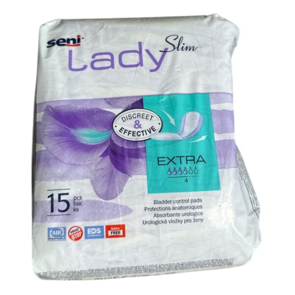 Absorbante incontinenta urinara femei Seni Lady Slim Extra 4 picaturi in cantitate de 15 bucati au fost concepute sa absoarba lichidele si sa mentina zona intima uscata si protejata de iritatii sau inflamatii. Acestea sunt suficent de subtiri, permitand utilizarea lor intr-un mod discret sub haine, fara sa creeze disconfort. Absorbantele pentru incontinenta urinara femei sunt fabricate din material foarte moale si delicat la atingerea cu pielea, au forma ergonomica ce permite mularea perfecta pe corp si se pot fixa intr-un mod sigur. Seni Lady Extra Slim au fost concepunte in mod special pentru incontinenta urinara usoara pana la moderata.