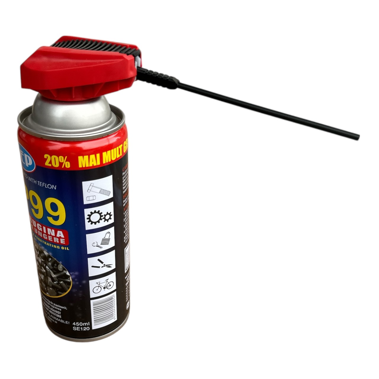 Spray-ul Sep99 pentru ungere cu proprietati anti-rugina in cantitate de 450 ml, curata si protejeaza orice fel de masinarii mecanice, indepartand umiditatea si prevenind ruginirea pieselor metalice. Spray-ul Sep99 poate fi folosit cu incredere la automobile, in gospodarie, in camere electrice, pe vase metalice si in orice alte mici probleme din gospodarie, in ceea ce priveste rugina, chiar si in locurile greu accesibile, multumita capului cu teava subtire si lunga ce va face lucrul mul mai usor. Spray-ul antirugina Sep99 este imbunatatit cu teflon ce creaza stratul super protectiv nu numai impotriva ruginii si si altor factori externi ce intra in contact cu suprafetele unse.