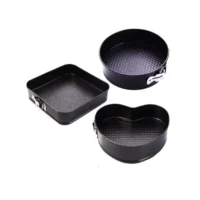Setul de 3 forme pentru blatul tortului, cu design-uri diferite (rotund, inima si patrat), sunt fabricate din otel teflonat. Aceste forme sunt prevazute cu baza detasabila, care poate fi desprinsa prin deschiderea clemelor existente pe peretii laterali sunt ingenioase intrucat faciliteaza procesul de scoatere a blatului gata copt, asigurand ca acesta pastreaza forma si aspectul dorit. Materialul teflonat confera proprietati antiaderente, ceea ce face ca formele sa fie usor de curatat si sa ofere un rezultat impecabil pentru prajituri sau torturi. Setul cu forma inima, rotund si patrat va pune in evidenta creativitatea in bucatarie, permitandu-va sa preparati deserturi in diferite forme cu aspect atractiv.