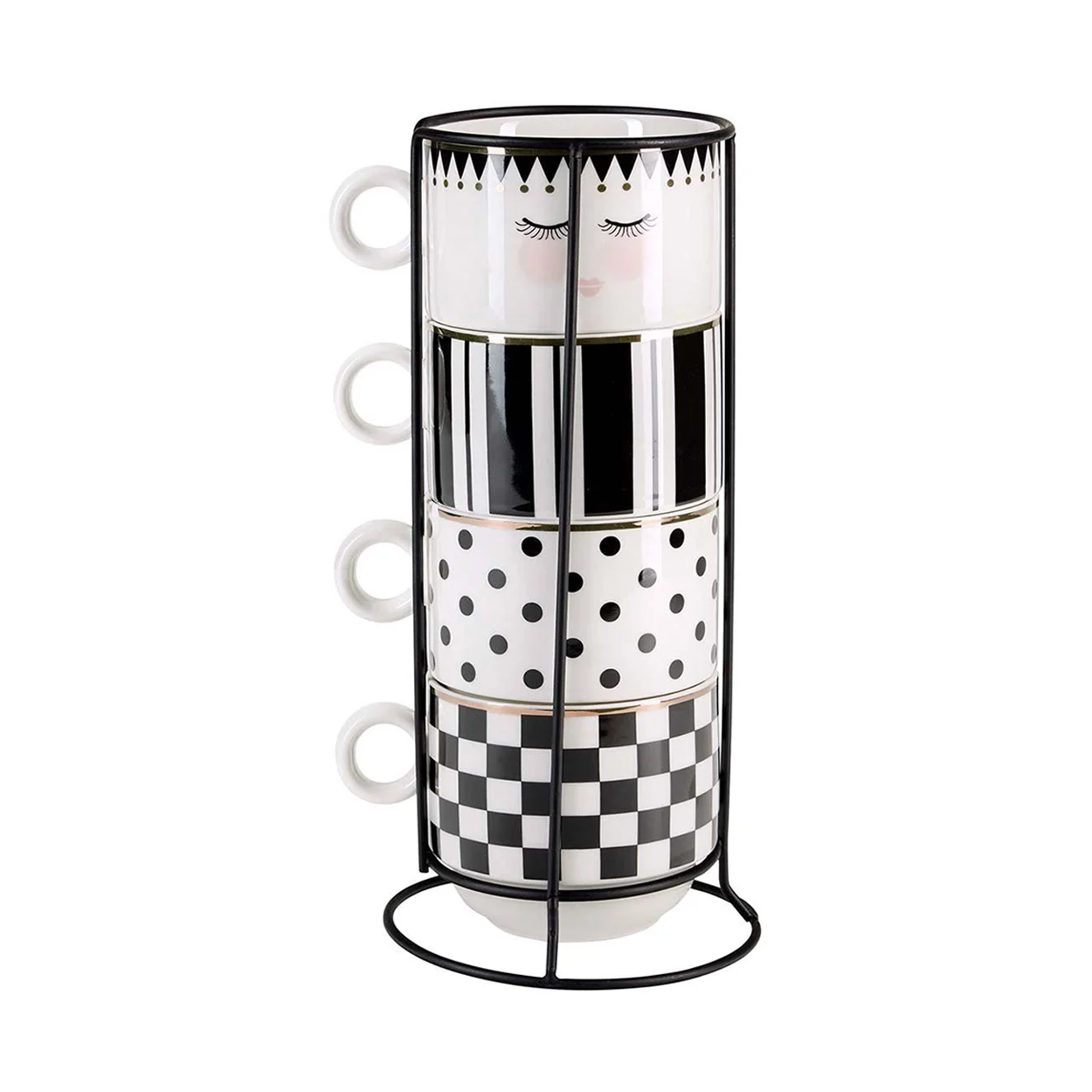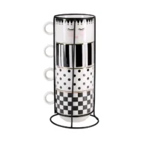 Setul de 4 cesti de cafea in suport metalic vertical va ofera posibilitatea sa serviti o cafea calda si aromata cu rafinament, elengata si stil. Acestea sunt fabricate din ceramica au forma cilindrica sunt dotate cu manere laterale in forma rotunda iar baza lor permite depozitarea lor una peste alta. Suportul vertical este robust si stabil, intrucat este din otel si vopsit in negru. Cu acest set veti oferi organizare blatulu ide bucatarie. In plus, fiecare ceasca din ceramica are o capacitate de 250 ml, suficient pentru cafeaua de dimineata. De asemenea, Setul mai poate fi utilizat si pentru alte bauturi aromate si calde, precum ceaiul fiind o alegere foarte buna pentru acasa si birou.
