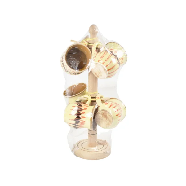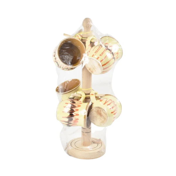 Setul de 6 cani din cu suport vertical din lemn ofera un strop de eleganta rustica si farmec mesei tale. Canile sunt fabricate din lut natural au forma usor bombata, sunt dotate cu toarte si asigura rezistenta la caldura intensa. In plus, sunt placut pictate pe exterior cu diferite forme si modele. Suportul vertical este obtinut din lemn de fag natural finisat, ce completeaza aspectul artizanal adaugand autenticitate si farmec intregului set. Mai mult decat atat, lutul este cunoscut pentru proprietatile sale izolatoare termice, mentinand bauturile calde la o temperatura potrivita pentru o perioada mai lunga de timp. Setul cu 6 cani din lun cu suport vertical din lemn este excelent pentru servirea bauturilor traditionale tari, cum ar fi: tuica, horinca sau palinca.