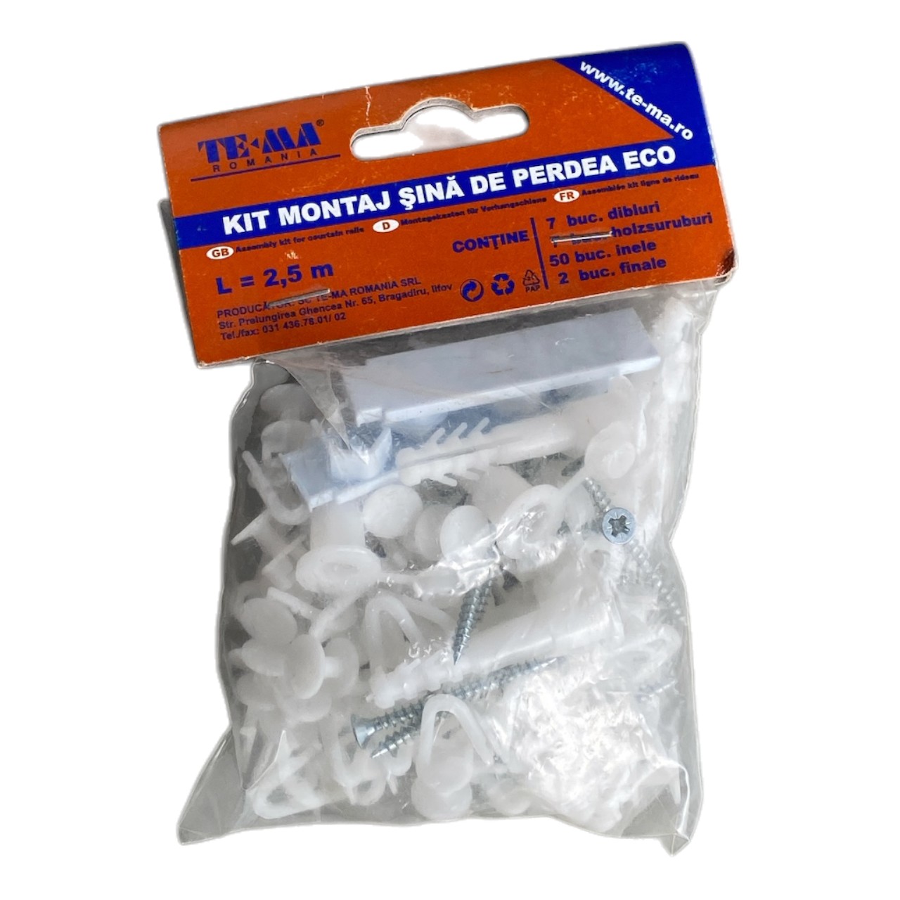 Setul accesorii montaj sina de perdea , cuprinde 50 de inele/calareti, 2 finale, 7 dibluri si 7 holzsuruburi. Acestea sunt fabricate din materiale de calitate superioara si au rolul de a fixa sina in tavan si de a sustine perdelele pe sina facilitand in acest fel manevrarea perdelei. Inelele, cunoscute sub denumirea populara de calareti, au culoarea alba si sunt foarte durabile in timp, ne fiind afectate de umiditate, greutatea perdelei au uzura continua, asigurand o buna functionare ani la randul.