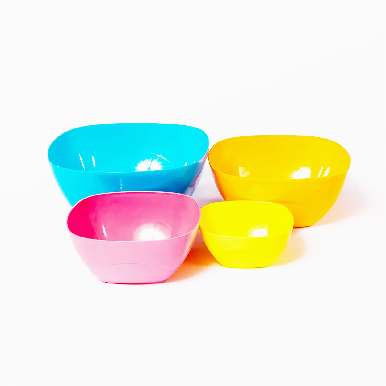 Setul de castroane din plastic cu forma patrata avand capacitatile de 0.7 litri, 1.8 litri, 3.3 litri si 5 litri au fost concepute sa fie folosite in orice tip de bucatarie clasica, moderna sau profesionala pentru manipularea, transportul, depozitatea si prepararea diferitelor mancaruri. Acest set de castroane / boluri sunt fabricate din plastic de tip alimentar (polietilena) pentru a asigura o rezistenta sporita la uzura, socuri, (in cazul in care le scapati pe jos) si la modificarile bruste de temperatura. Mai mult decat atat, indiferent de tipul de mancare preparat sau depozitat, acestea nu vor retine mirosurile.