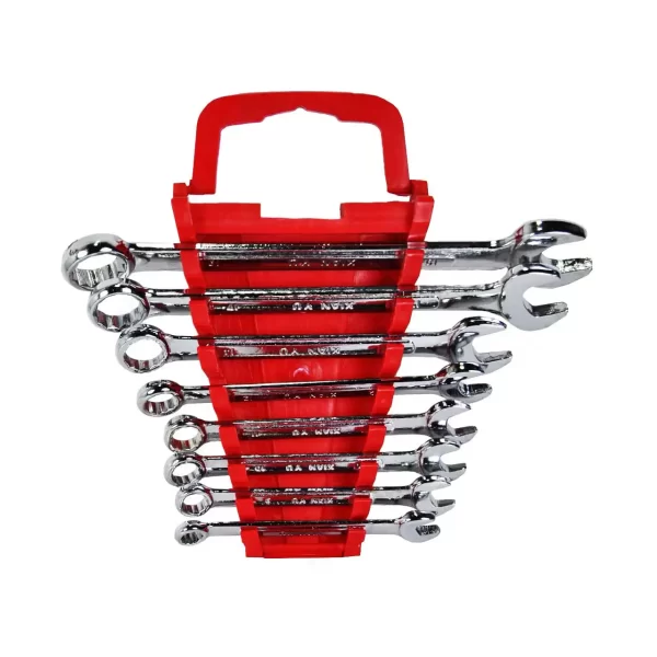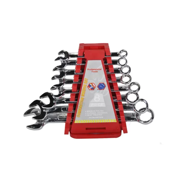 Setul de chei combinate lungi de 8-19 mm este format din 8 piese realizate dintr-un otel dur cu capete invaluite in crom-vanadium ce asigura multiple utilizari fara ca acestea sa se toceasca sau sa se deterioreze in timp. Setul de chei combinate lungi vin intr-un suport din plastic in forma dreptunghiulara, prevazut cu maner ce asigura un transport usor a intregului set, astfel incat sa va fie la indemana in momentele in care aveti nevoie. Cheile combinate lungi sunt excelente pentru industria auto sau uzul casnic pentru strangerea sau desfacerea rapida a suruburilor.