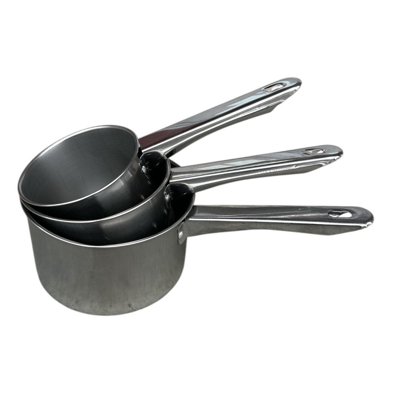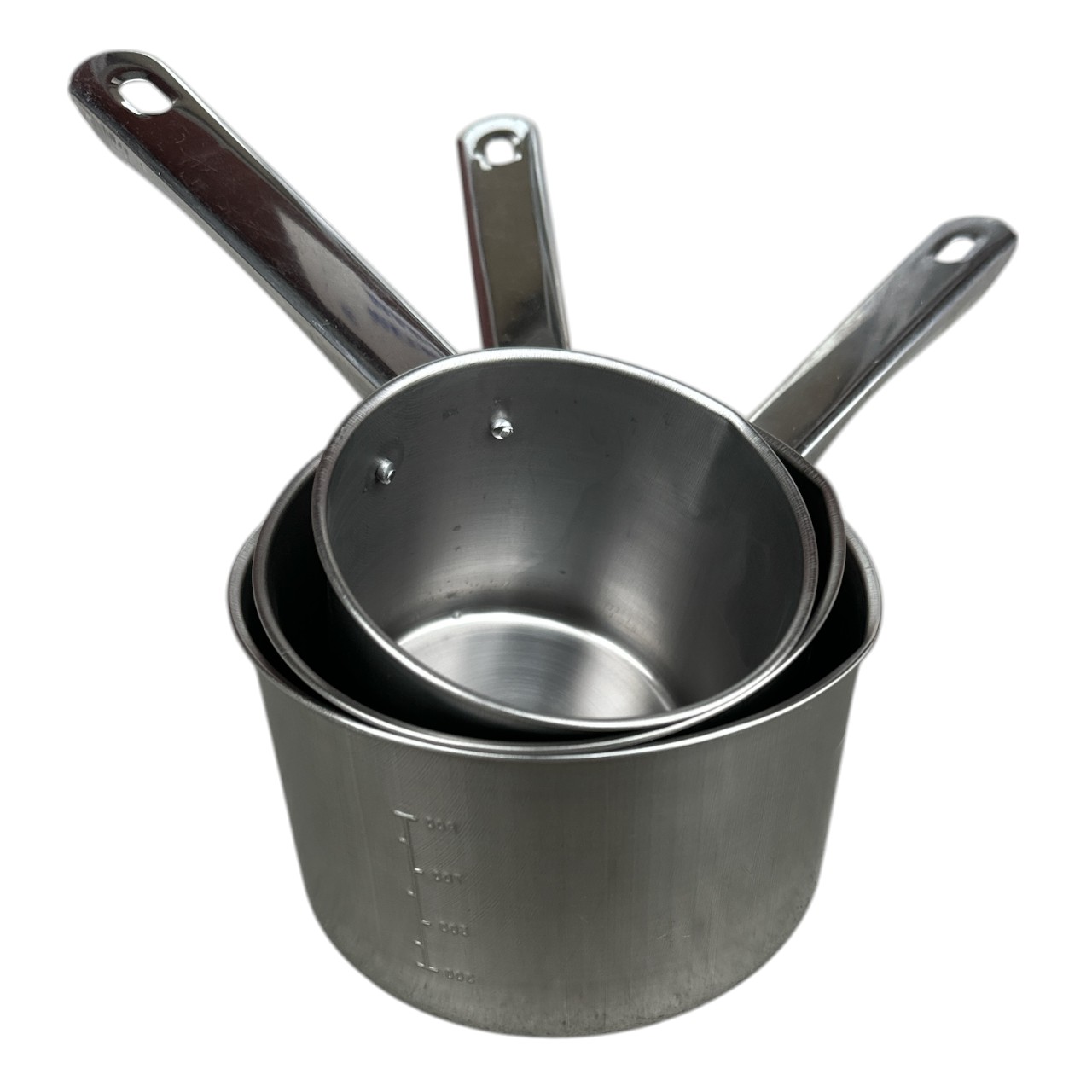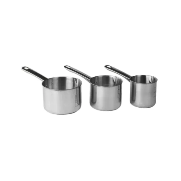Setul cu imbrice din inox, gradate cu capacitati de 500 ml, 700 ml si 1000 ml (1 litru) avand diametre de 10 12 si 14 cm sunt obtinute in totalitate din inox netoxic (alimentar) sunt deotate cu toarte din acelasi material si au fante de turnare (ciocuri). Aceastea sunt extrem de utile in bucatariile profesionale dar si casnice pentru prepararea ceaurilor, cafelelor de orice fel, in fierberea unor alimente cu dimensiuni reduse si nu numai. Setul cu ibrice inox gradate nu vor modifica gustul lichidelor sau mirosul lor, asigurand o fierbere mai rapida. In plus, fiind gradate, veti putea masura cu exactitate cantitatea necesara de lichid.