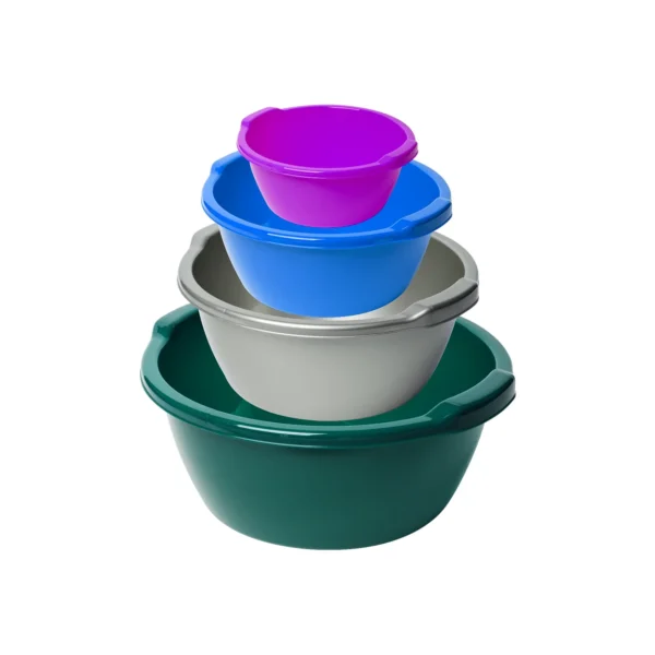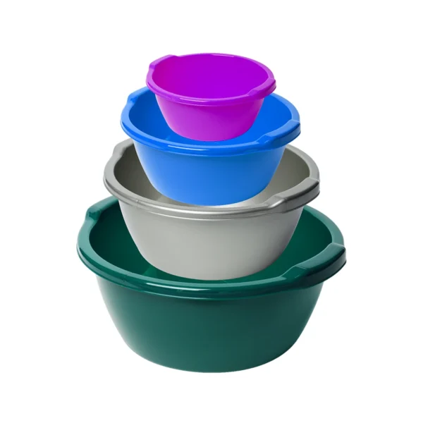Setul de ligheane plastic, rotunde incorporate pe laterale cu manere in cantitate de 4 bucati include urmatoarele capacitati: 3 L, 5 L, 8 L si 12 L. Acestea sunt de mare folos intr-o gospodarie sau bucatarie intrucat sunt realizate din plastic alimentar (netoxic in contactul cu alimentele), sunt flexibile si foarte rezistente impotriva variatiilor de temperatura, socurilor mecanice de impact ca si substamtelor chimice. In functie de necesitate puteti alege unul din cele 4 capacitati. Fie ca doriti sa hraniti animalele domestice din curte, sa lasati un aluat sa "creasca" sau sa puneti la inmuiat rufe, aceste ligheane plastic vor fi de mare ajutor in toate aceste activitati. In plus, manerele incorporate pe laterale, faciliteaza un transport usor si o manipulare comoda.