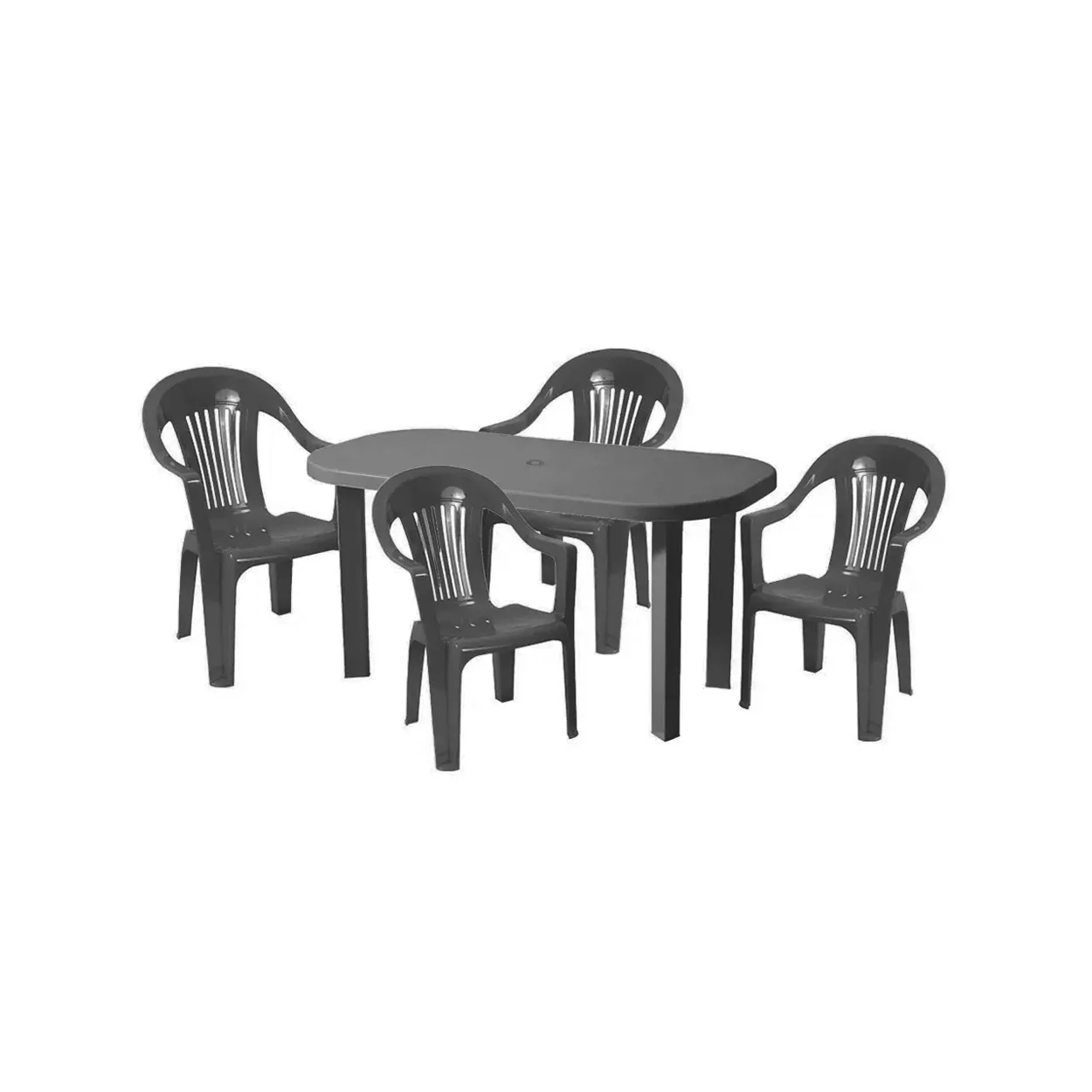Setul compus dintr-o masa si 6 scaune din plastic de culoare gri, este perfect pentru amenajarea unui spatiu de relaxare confortabil si functional in aer liber. Masa este realizata din polipropilena, are un design simplu si modern cu laturi rotunjite, oferind suficient spatiu pentru a servi masa in familie sau cu prietenii. Scaunele sunt fabricate din acelasi material ca si masa (popipropilena) sunt ergonomice si confortabile, fiind rezistente la intemperii, inclusiv la razele solare UV, umiditate sau socuri mecanice moderate facandu-le perfecte pentru utilizarea pe termen lung. Masa are picioare detasabile iar scaune sunt dintr-o bucata, dispunand de spatar usor arcuit si manere fixe.