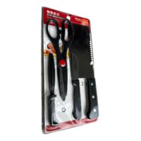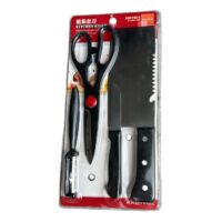 Setul cu ustensipe pentru bucatarie in cantitate de 4 bucati cuprinde un cutit mic de taiat legume, un curatator, un satar de macelarit si o foarfeca. Acestea sunt fabricat din otel durificat si au rolul sa va ofere minimul necesar intr-o bucatarie, atunci cand doriti sa preparati mancare. Fiecare ustensila este prevazuta cu maner ergonomic care nu permite alunecarea, asigurand fermitate atunci cand le utilizati. In plus, acestea sunt foarte bine ascutite, astfel incat sa nu intampinati probleme sau neplaceri in timpul utilizarii. Pentru utilizari indelungate, dupa fiecare folosire este recomandat sa le spalati si sa le uscati cu un prosop.