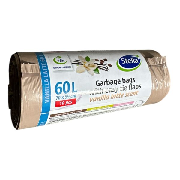 Sacii de gunoi parfumati cu aroma de vanilla latte au o capacitate de 60L si vin la rola de 16 bucati oferind utilitate pentru gospodarii mari sau pentru gestionarea deseurilor menajere voluminoase. Sacii de gunoi sunt fabricati din LDPE / polietilena cu densitate scauzta, pentru a oferi flexibilitate si o rezistenta buna, prevenind ruperea lor sau scurgerea lichidelor. Multumita parfumului aromatic si delicat al vaniliei cu lapte (vanilla latte), nu doar ca retin deseurile, dar si improspateaza aerul din incapere. Urechile integrate pe marginea lor permit o inchidere sigura si usoara, asigurand posibilitatea unui transport rapid si comod a deseurilor.