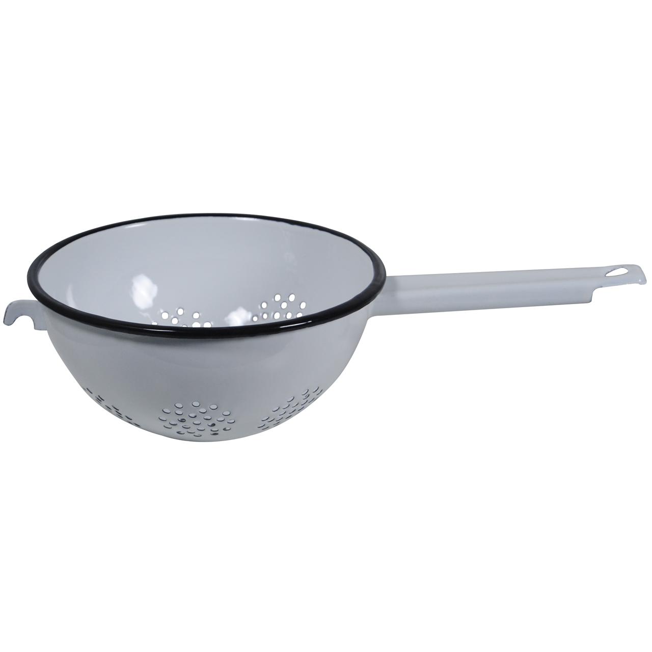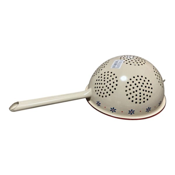 Modelul de strecuratoare emailata cu coada 18 cm este fabricata in forma de semicerc din metal dur, tratat cu email. Emailul este un material cu grad 0 de risc asupra sanatatii, avand proprietati antibacteriene, indiferent de temperatura la care se prepara mancarea. Datorita cozii, aceasta strecuratoare emailata cu coada 18 cm are in dotarea sa un maner solid care ajuta la manevrarea preparatelor fierbinti cum ar fii pastele sau orice alte legume fierte iar depozitarea acestei excelente unelte se poate face cu cu mare usurinta multumita agatatorii din capatul cozii.
