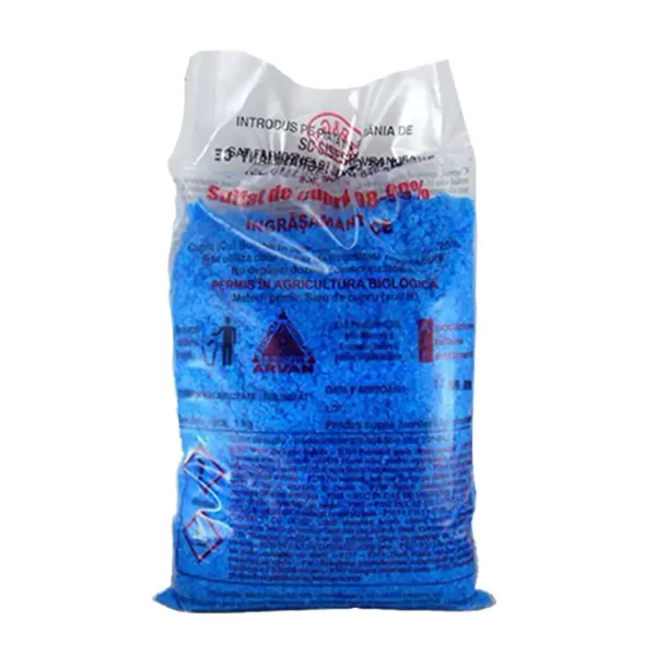 Sulfatul de cupru cunoscut si sub termenul popular de piatra vanata ce vine ambalat la punga de 1kg este o sare obtinuta din cupru cu acid sulfuric avand formula chimica CuSO4. Piatra vanata are o multime de alte denumiri precum: vitrol albastru, piatra albastra, bonatit, calcanit, sulfat cupric sau calcoyanit, insa cele mai uzuale sunt sulfatul de cupru si piatra vanata si se obtine in urma reactiei oxidului de cupru in contact cu acidul sulfuric si este folosita in general pentru crearea de zeama bordeleza (in combinatie cu varul stins / hidroxidul de calciu). Sulfatul de cupru (piatra vanata) este solubila (se dizolva in apa) devenind potrivita ca ingrasamant pentru stropit pomi, la rosii, vita de vie cat si pentru flori cum ar fi pentru trandafiri. Sulfatul de cupru are un mod de preparare rapid si este folosit cel mai des in ramurile agriculturii.