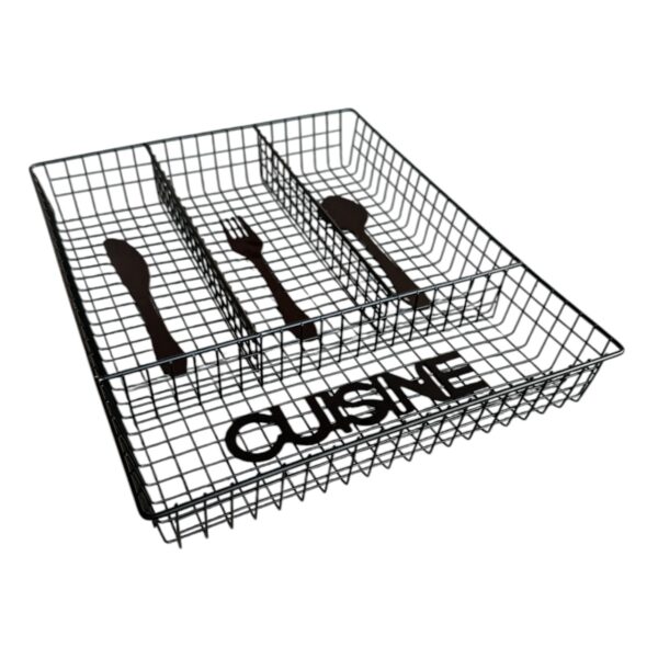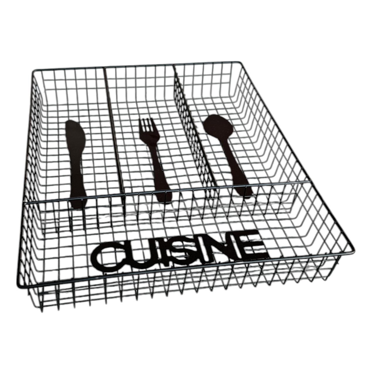 Suport tacamuri de sertar din metal cu dimensiunile de 32x26x5 cm, dispune de 4 locuri separate, special concepute pentru a organiza furculite, cutite, linguri si lingurite sau alte ustensile de bucatarie. Constructia sa este sub forma de plasa patrata, oferindu-i un aspect modern si practic. Fiecare locas al suportului este decorat cu tacamuri negre, adaugand un element de eleganta si contrast designului. Mesajul "cuisine" (bucatarie) adauga o nota prietenoasa si personalizata suportului, transformandu-l intr-un accesoriu placut pentru organizarea tacamurilor in bucatarie. Cu acest suport de sertar, veti mentine ordinea in bucatarie si veti avea acces rapid la ustensilele necesare la gatit sau servit mancare.