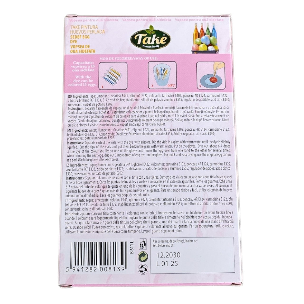Vopseaua de oua sidefata de la Take va ofera 4 culori puternice (albastru, galben, rosu si verde) pentru vopsirea oricarui tip de ou, fie ca este vorba de cele de gaina, de rata, sau bibilica sau prepelita. Acest tip de vopsea oua este una lichida, foarte usor de utilizat. Tot ce aveti nevoie este sa spalati bine oualele sa nu prezinte urme de grasime pe ele, apoi se fierb la foc mic. Intr-un alt vas, vom amesteca 300 ml de apa fierbinte impreuna cu 5 linguri de otet si cu vopseaua de oua lichida. Scufundati fiecare ou separat, in vopsea pana este acoperit complet, timp de mai multe minute.