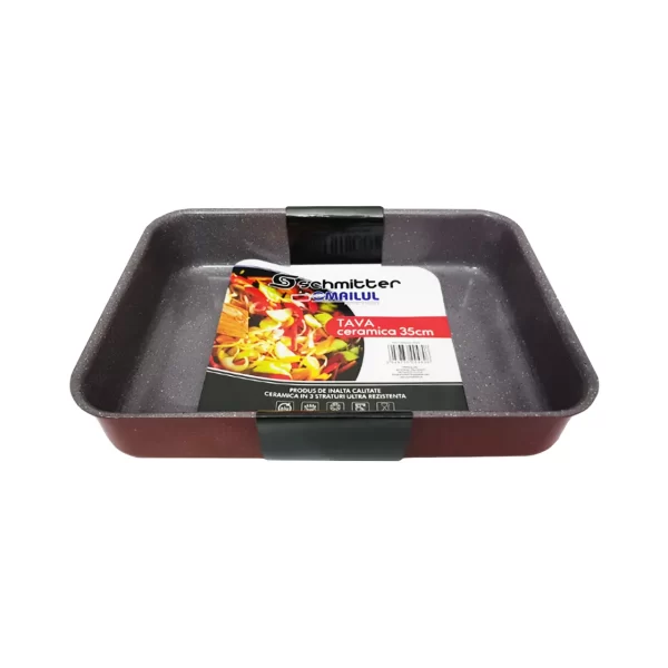 Tava aluminiu turnat cu ceramica Schmitter cu dimensiunea de 35x26 cm este un vas de copt si gatit esential atat in bucataria dumneavoastra cat si in bucataria profesionala dintr-un restaurant. Aceasta ofera performante superioare intrucat permite sa gatiti la cuptor preparate delicioase si sa va bucurati de rezultate excelente in fiecare masa. Constructia solida formata din aluminiu turnat si interior acoperit cu ceramica (in 3 straturi) ofera durabilitate foarte mare, rezistenta la coroziune, lovituri si asigura o distributie uniforma a caldurii, prevenind in acelasi timp lipirea alimentelor.