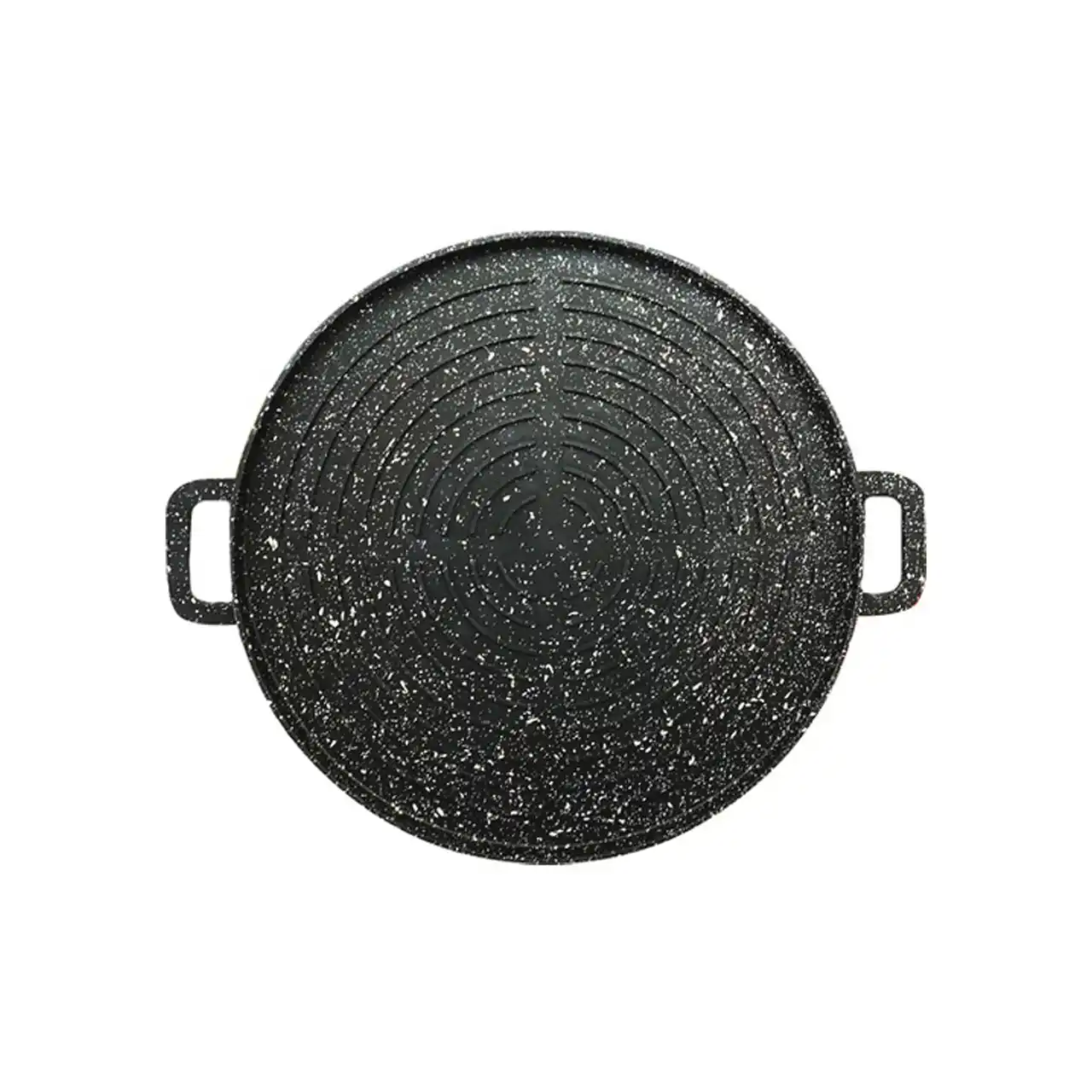 Tava din granit in forma rotunda, dotata cu manere avand dimetrul de 36 cm si culoare neagra cu punctulete albe este ideala pentru un gatit sanatos, fara grasimi sau fum. Tigaia de granit rotunda poate fi utilizata pe ambele fete, in cuptor sau pe aragaz pentru prepararea carnii (fripturi), pentru clatitele traditionale sau americane, legume sau pita (paine). Intrucat plita este din granit, va suporta cu succes temperaturile foarte ridicate (nu se topeste), nu se zgaraie si nu se sparge in cazul in care este supusa unor socuri involuntare. Forma sa rotunda si diametru mare va poate ajuta sa preparati chiar si pizza sau alte aluaturi mari. Aceasta tigaie din granit nu va da voie lipirea alimentelor si nu este pretentioasa in privinta ingrijirii (doar o spalati la finalul utilizarii).
