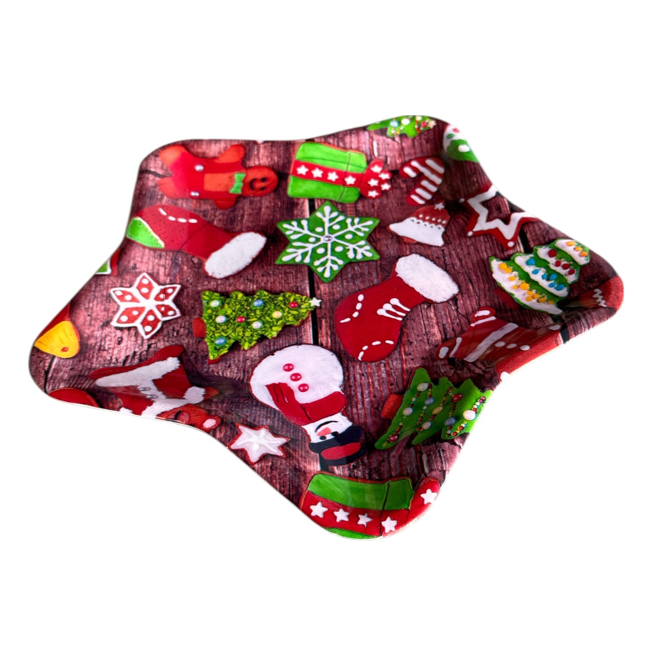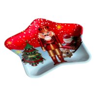 Tava din plastic in forma de stea cu diametrul de 25 cm de culoare crem si decorata in interior cu multiple mesaje precum "Merry Christmas", "Ho Ho Ho", "Greetings", stelute si tilpini de brad, adauga un "touch" vesel oricarui eveniment in aproprierea sarbatorilor de iarna. Tava este fabricata din plastic inert chimic, fiind sigura pentru alimente este practica dar si decorativa. Design-ul sau in forma de stea confera un aspect distinctiv Craciunului, facand aceasta tava potrivita pentru servirea bauturilor calde sau reci, gustarilor sau pentru a aseza diverse delicatese dulci. Culoarea crem ofera o nota calda si eleganta, potrivindu-se bine cu tema Craciunului. Mesajele festive si elementele de decor adaugate pe interiorul tavii, precum "Merry Christmas", "Ho Ho Ho", contribuie la crearea unei atmosfere pline de bucurie si anticipare pentru sarbatori, iar tulpinile de brad si stelutele ofera naturalitate si traditie.