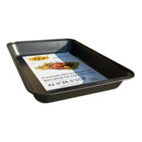 Tava din teflon pentru friptura la cuptor cu dimaneiunea de 42.5 x 28.5 x 5 cm cm este obtinuta din metal teflonat in intregime astfel incat sa nu permita lipirea preparatelor sau arderea lor, ci din contra! asigura un transfer termic uniform si o coacere in profunzime a carnii de porc, miel, pui, etc. Tava teflon pentru fripturi poate fi utilizata cu succes si pentru prepararea delicioaselor prajituri, cum ar fi: negresele, pandispanul, placintele etc. Multimita faptului ca este in intregime teflonata, tava poate fi spalata foarte rapid si usor, fara sa fie necesara frecarea suprafetei.