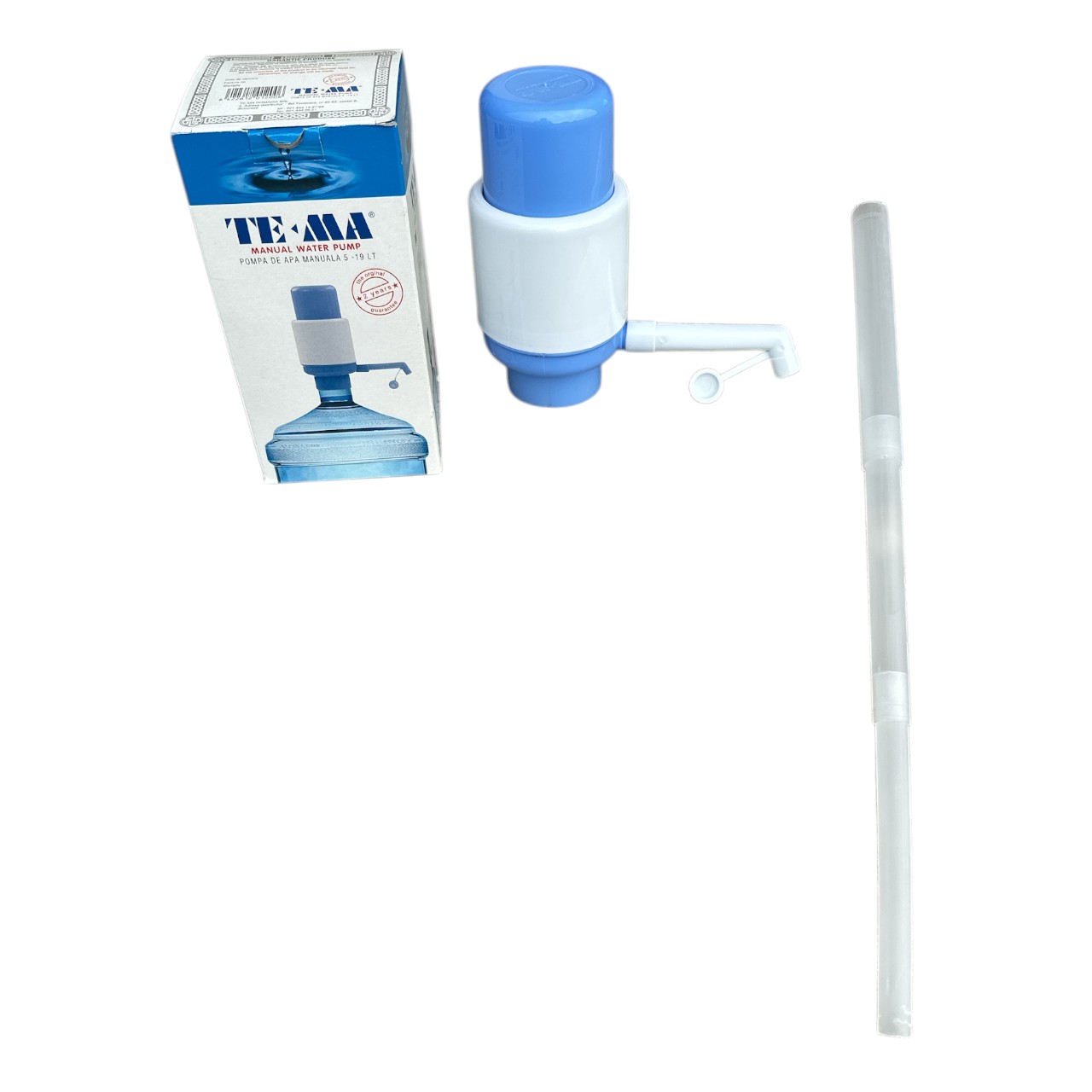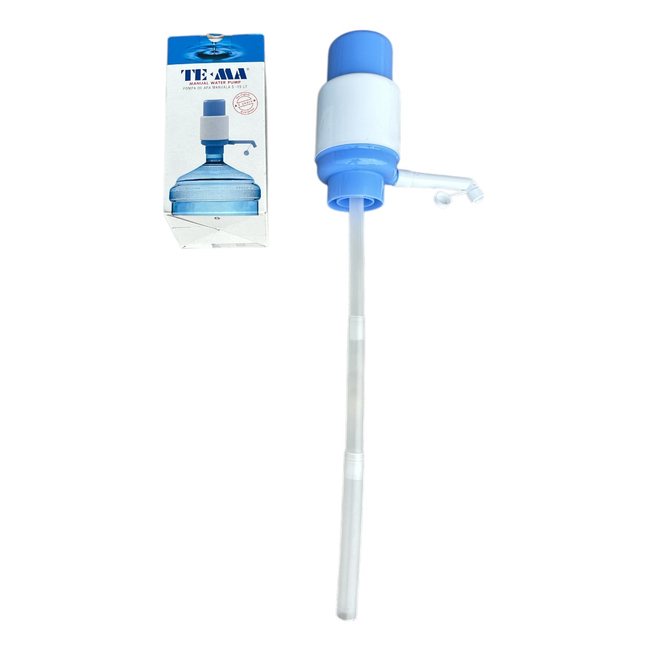 TE-MA pompa de apa pentru bidon de 20 L este o pompa manuala, foarte utila pentru bidoanele de apa sau alte lichide. Pompa are un buton mare care necesita apasarea de 2-3 ori pentru preluarea apei din bidon si turnarea ei in alte recipiente de baut. Pompa manuala pentru bidon, este obtinuta din polietilena de inata densitate, nu este toxica si nu modifica aroma sau mirosul apei sau sucului din bidon. Pompa este compatibila cu peturile de 5L, 8L, 10L si cu recipientele de plicarbon de 12L si de 19-20 de litri.