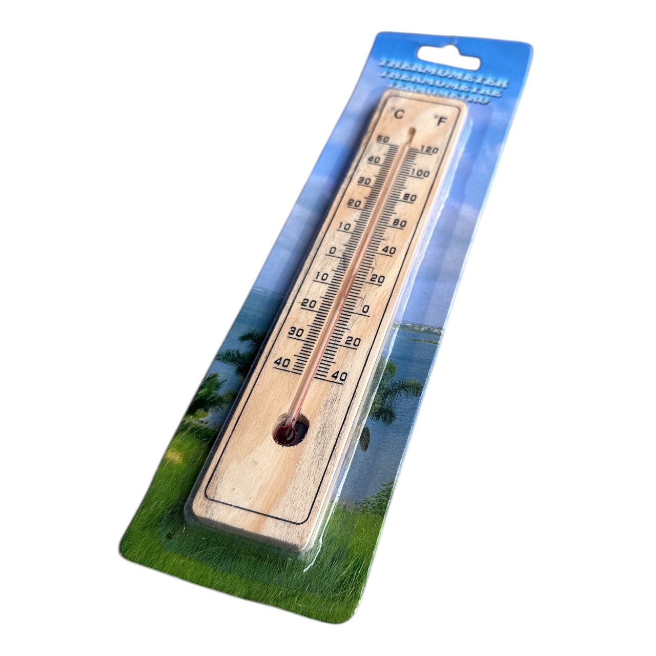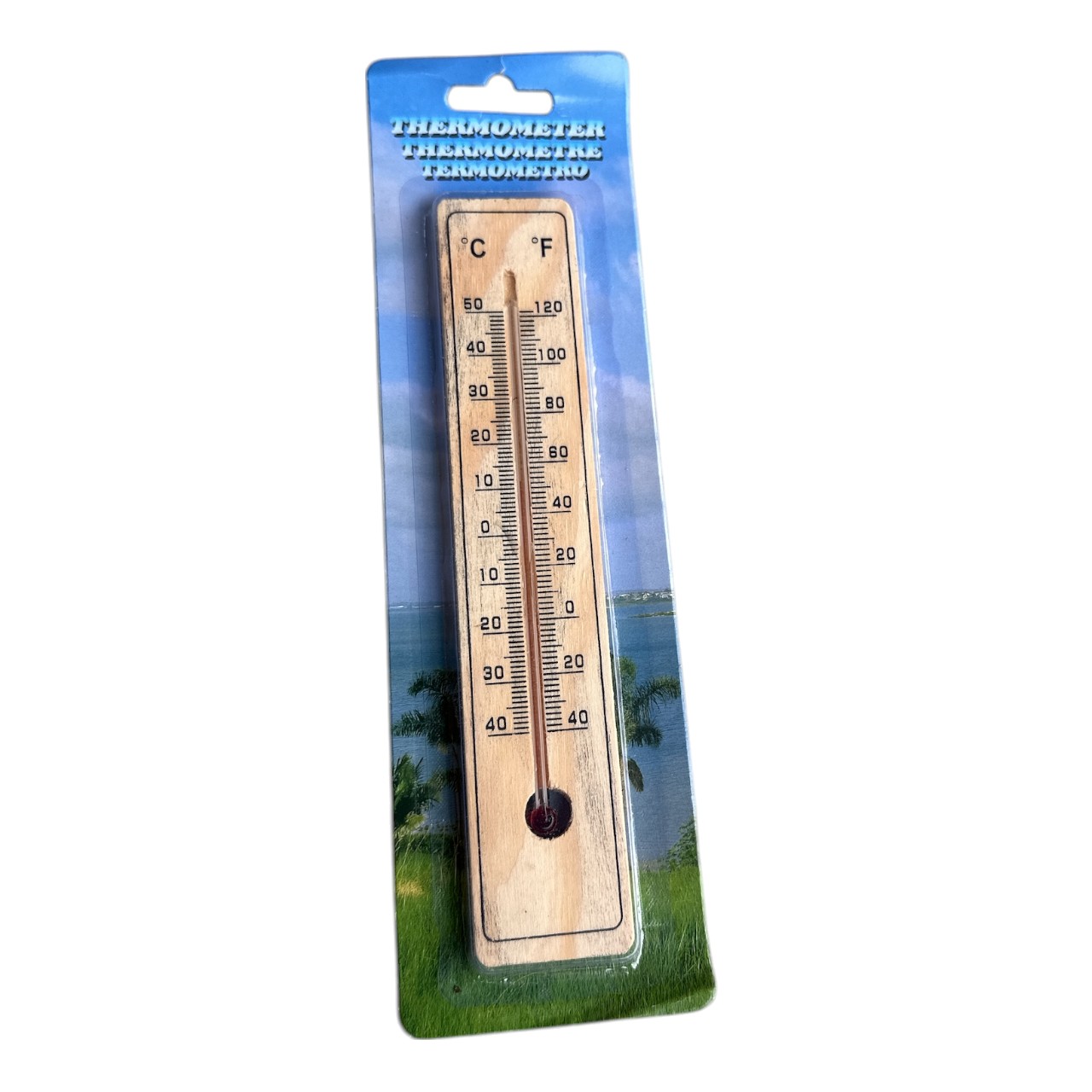 Termomentrul pentru exterior si interior fabricat din lemn natur, se distinge prin simplitatea lui cat si designul rustic. Acest tip de termometru de exterior si interior dispune de doua moduri de citire a temperaturii si anume, pe stanga in grade °C (celsius) si pe dreapta in °F (Fahrenheit) cu banda lichida intre cele doua gradatii. Lichidul urca si coboara datorita contractarii sau dilatarii acestuia, in functie de temperatura ambientala. Termometrul de interior sau exterior se agata in locuri ferite de razele directe ale soarelui incat sa nu fie influentat si sa indice eronat.