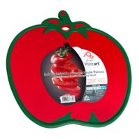 Tocatorul din plastic de bucatarie in forma de rosie cu dimensiunile de 30.5 x 30 cm este un produs utilizat in special pentru protejarea blatului mese sau celui de lucru (al mobilierului), astfel incat sa nu-l zgariati sau deteriorati in vreun fel. Tocatorul este realizat din policlorura de vinil durificat si are pe margini un invelis special din cauciuc avand rolul de a previni alunecarea pe suprafetele pe care lucrati. Mai mult decat atat, acesta mai este dotat si cu un orificiu in partea superiaora ce permite agatarea lui pe un suport suspendat.