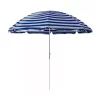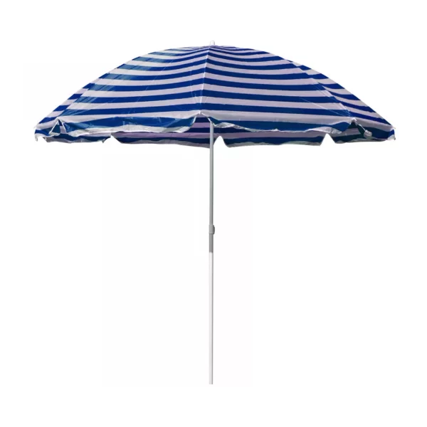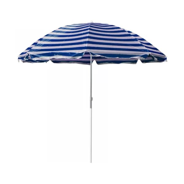Umbrela de soare pentru plaja sau piscina, colorata cu dungi albastre si albe, avand un diametru de 230 cm (deschisa) iti ofera o buna protectie impotriva razelor solare ultraviolete in timpul zilelor petrecute la plaja, piscina sau in propria gradina. Umbrela solara este placut decorata cu dungi albastre iar bara metalica este alba. Dispune de mecanism de deschidere si inchidere, rezistent la uzura repetata, iar panza umbrelei este obtinuta din material poliester care se intretine usor, rezista la umiditate si la vant.