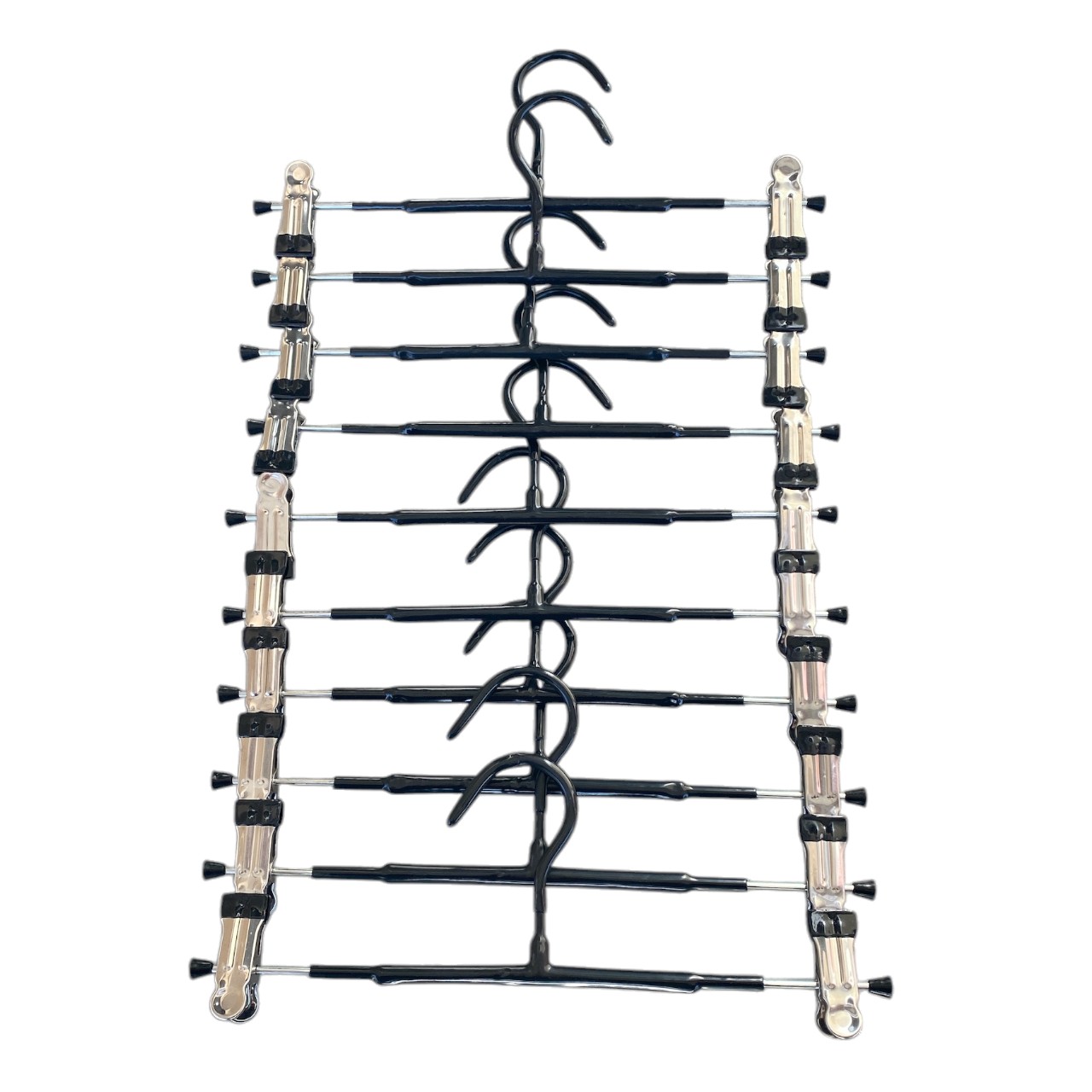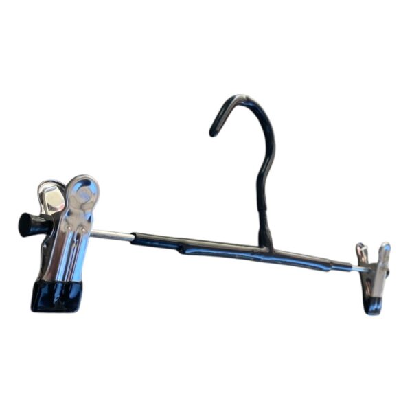 Setul de 10 umerașe metalice pentru pantaloni, cu protecție din cauciuc, este soluția perfectă pentru organizarea eficientă a garderobei tale. Cu o lungime a bazei de 300 mm, aceste umerașe sunt ideale pentru depozitarea sigură și compactă a pantalonilor, economisind spațiu și menținând hainele în stare impecabilă.